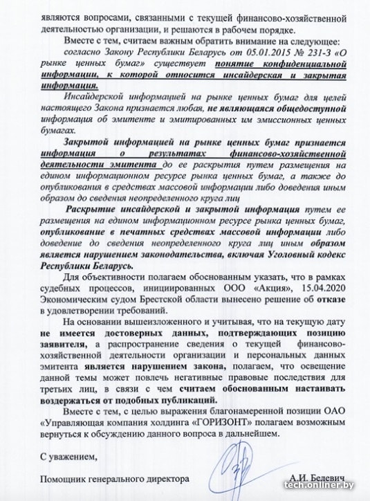 Мы обратились в ОАО «Управляющая компания холдинга „Горизонт“» за прояснением ситуации. Приводим комментарий в полном виде: