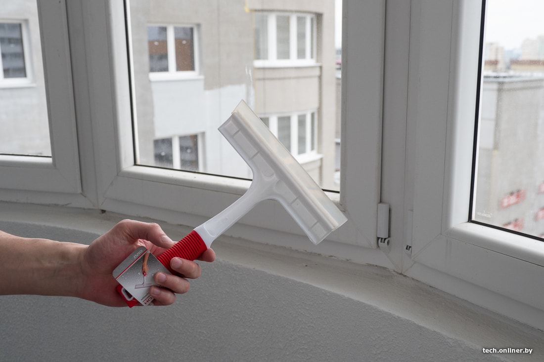 Мойка оконного стекла с одной стороны вручную (водой в тазике, тряпкой и газетой) заняла примерно полторы минуты. Газету можно заменить водосгоном с резиновой кромкой, но требуется навык. В противном случае останутся следы резины или несобранная вода. Водосгон с силиконовой кромкой оказался бесполезен.