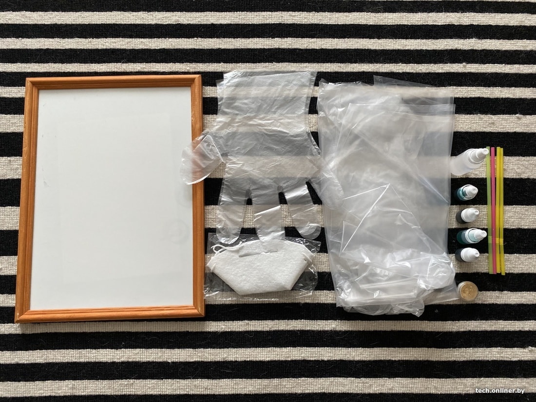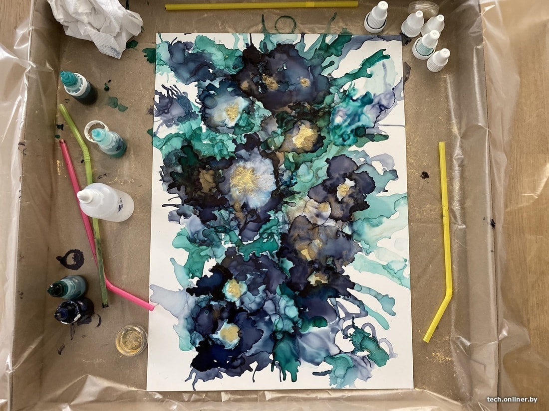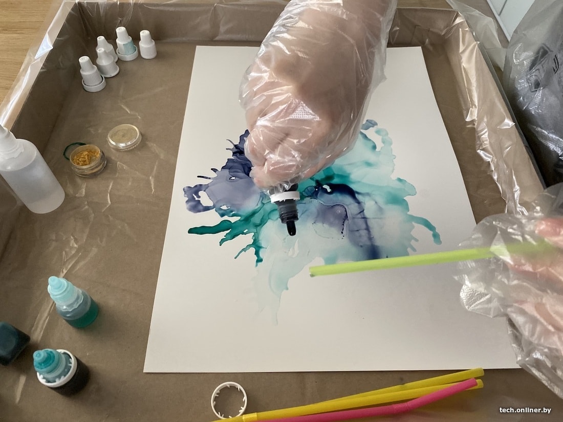Внутри — собственно чернила, а также рамка, бумага, коктейльные трубочки, много целлофана и бутылочка спирта. Также на почту высылают ссылку на видеофайл, где расскажут, что со всем этим делать. Если коротко, то разливаем чернила со спиртом, дуем в трубочку и получаем картину. В общем, нормальный воскресный досуг, а не то, что вы подумали.