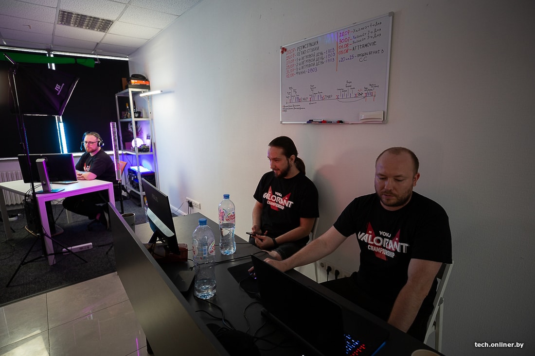 В студии VOKA Valorant Championship к нашему приезду заканчивалась подготовка к трансляции матча в шутере Valorant. Почему-то воображение рисовало огромные пульты с россыпью кнопок и переключателей — вроде тех, что используют музыканты для записи треков. Но для работы студии достаточно мощных ПК (используются Ryzen 3800X и Nvidia GeForce 1660), стабильного интернета и небольшой команды, которая целиком отвечает за то, что видят и слышат игроки.