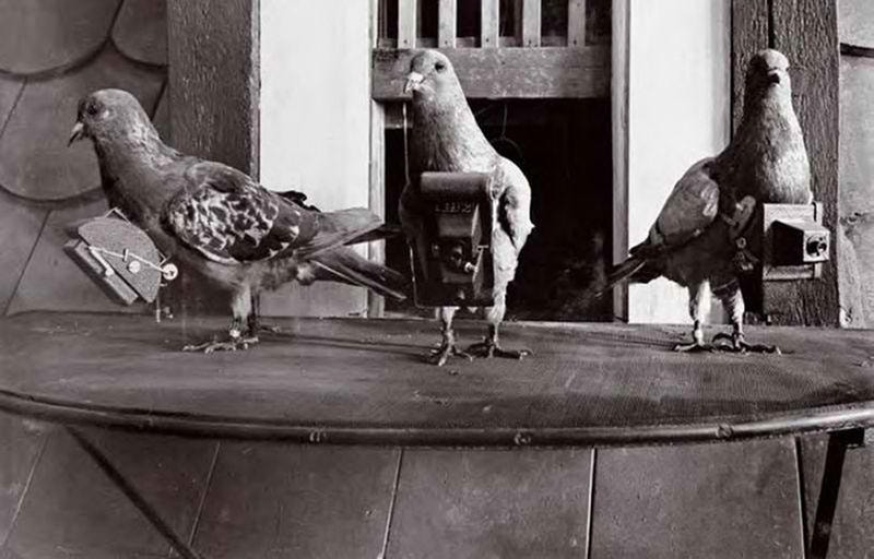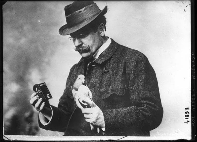 О голубях с прикрепленными к ним камерами, вероятно, знают многие. Их использовали для аэрофотосъемки еще в Первую мировую войну (а потом и во Вторую мировую), но первым, как предполагается, задумку воплотил в жизнь немецкий аптекарь Юлиус Нойброннер. В 1908 году он запатентовал «голубиную фотосъемку», описав способ крепления автоматических фотокамер на груди пернатых, снимающих происходящее внизу.