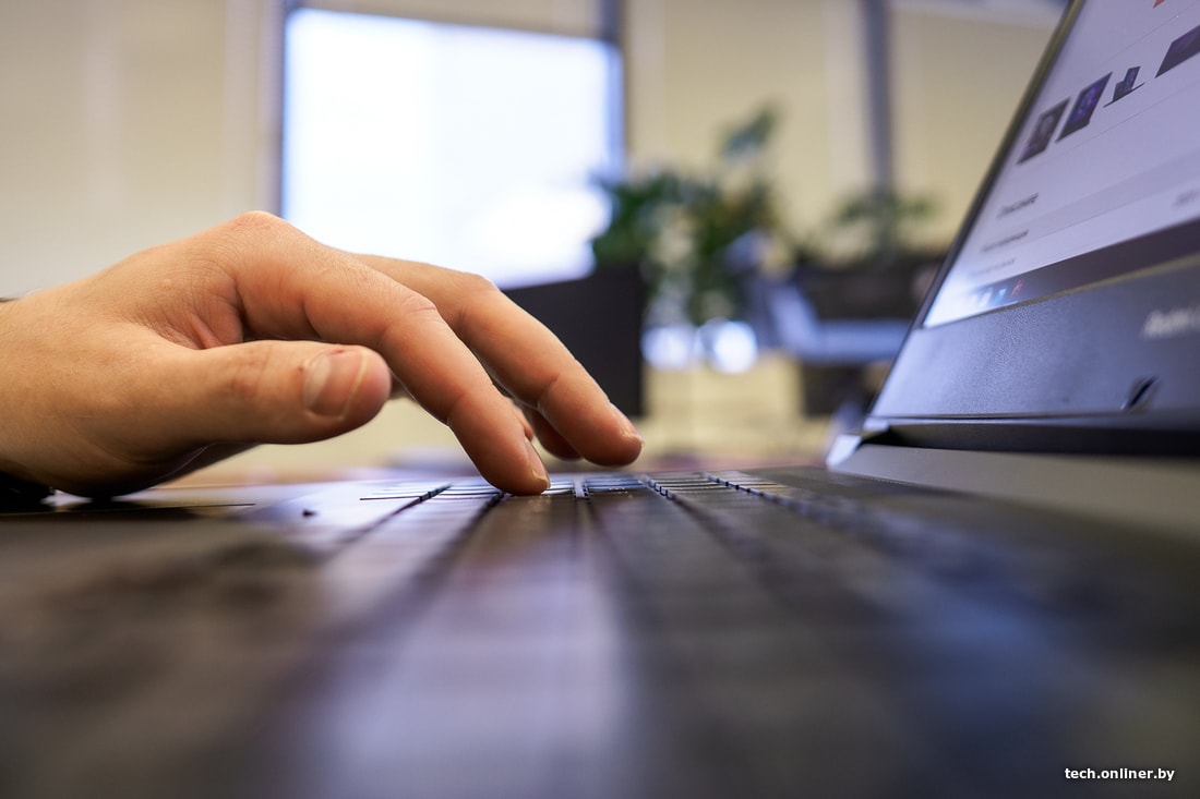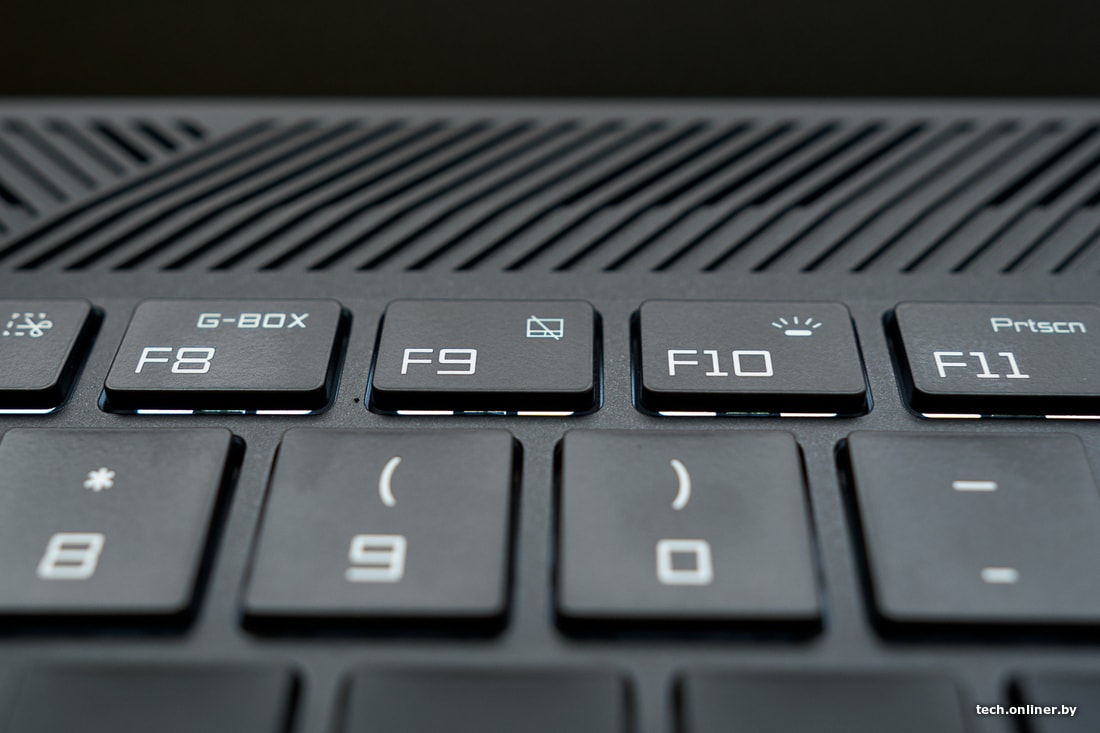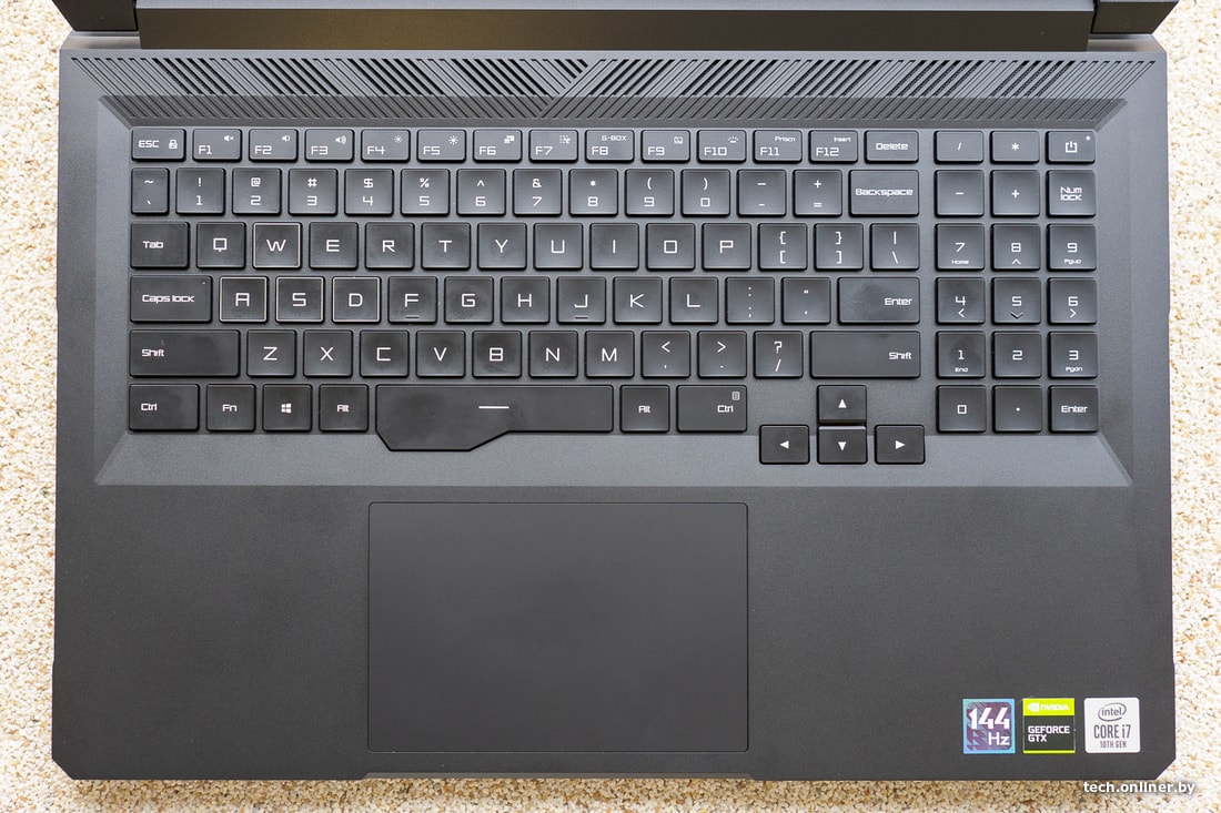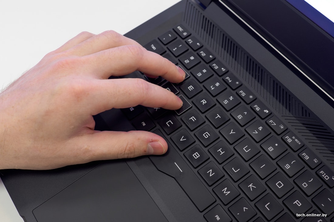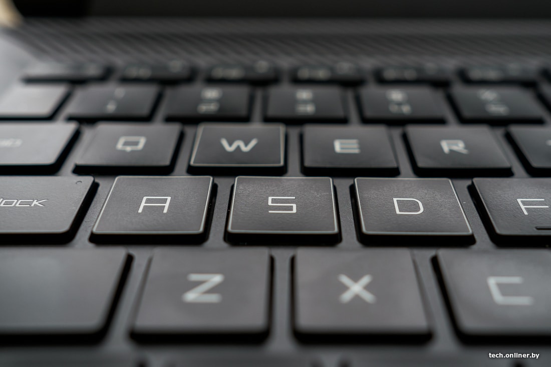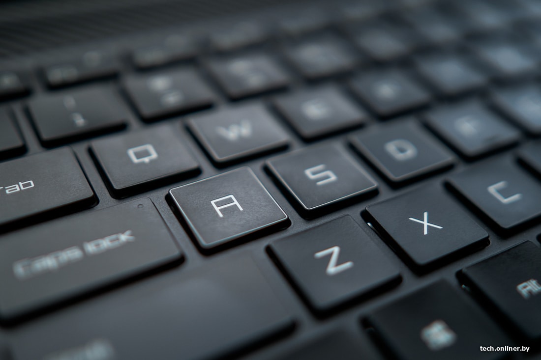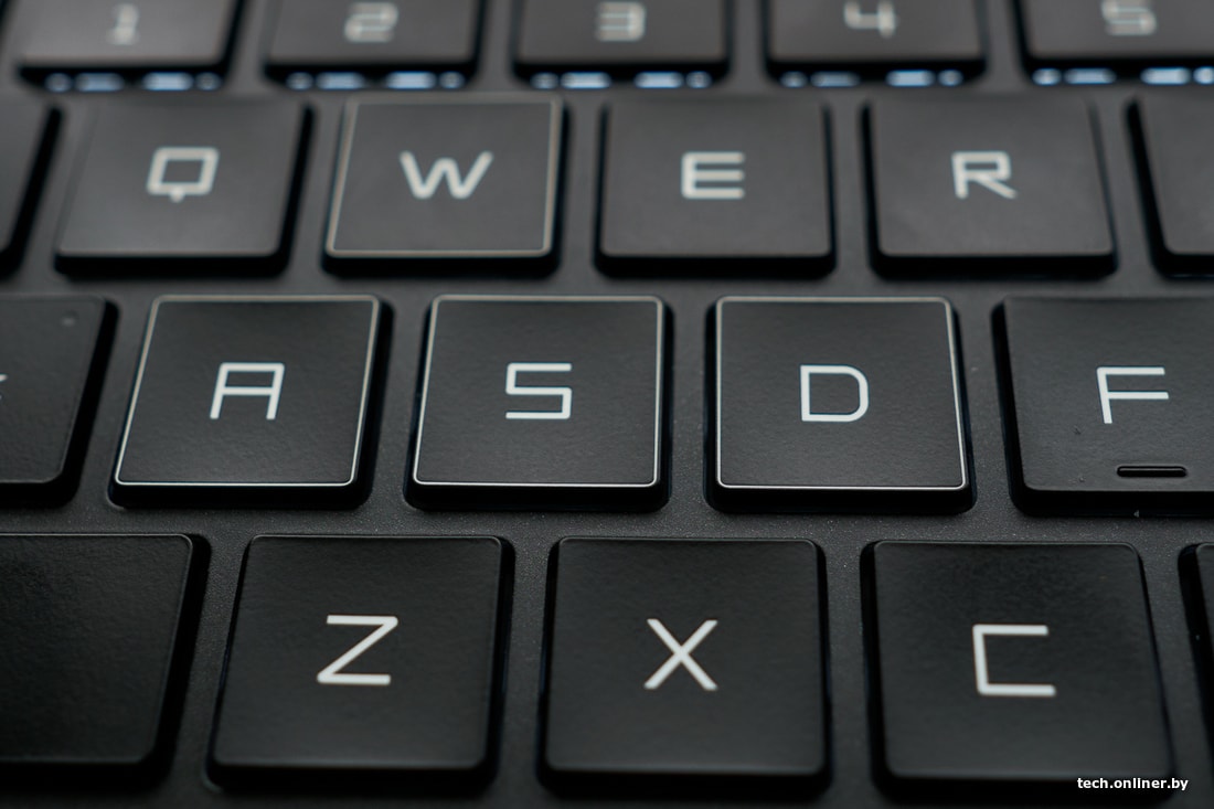 На ноутбуке приятно набирать тексты. Почти сразу привыкаешь это делать без опечаток. Традиционно для игровых ноутбуков клавиши WASD выделены по контуру. Пробел имеет удобный выступ для большого пальца. Навигационные стрелки отделены от клавиатуры. Справа цифровой блок с укороченным Enter. Клавиши подсвечиваются только белым светом без возможности настройки уровня или интенсивности.