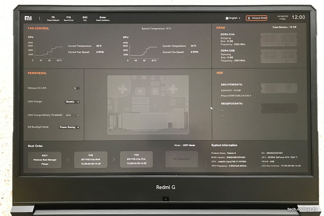 Мы не разбирали ноутбук, так как он еще пойдет на продажу. У Redmi G интуитивно понятный BIOS с возможностями мониторинга и традиционными настройками. Графически в нем отмечено расположение ключевых компонентов. Там же можно выбрать три режима работы: Turbo, Balanced, Silent. Ноутбук тестировался в Turbo-режиме для полноценной оценки его максимальной производительности. Вентиляторы довольно шумные, при этом без раздражающего свиста и дискомфорта. В сбалансированном режиме их слышно меньше. При офисной нагрузке они даже не включаются, и ноутбук работает очень тихо.