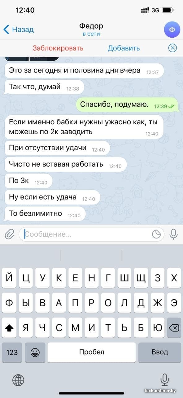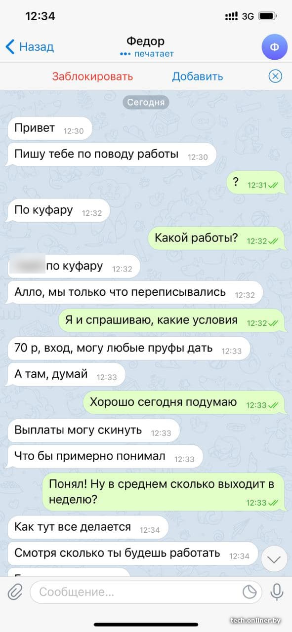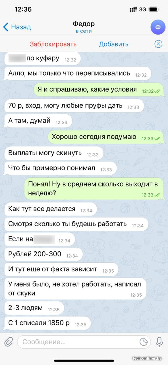 Мошенник, впечатлившись увиденным, предложил несостоявшейся жертве заработок и перешел для беседы в Telegram. Весь процесс был запечатлен на скриншотах.