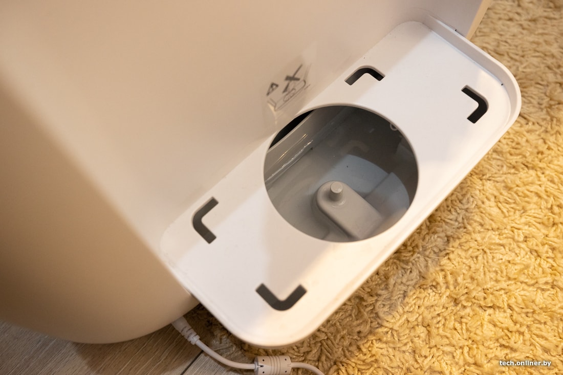 Как и Xiaomi Mi Air Purifier Pro H, эта модель имеет отсоединяемый кабель питания. Состоит девайс из двух половинок: в верхней находятся вся электроника и привод, а нижняя — чаша для воды с барабаном, который вращается и поднимает воду. Никаких баков нет — жидкость надо заливать прямо внутрь корпуса.