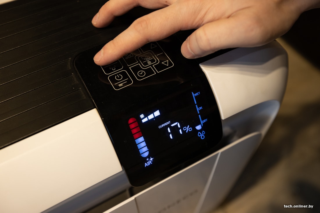 По размерам модель сопоставима с MiSoon, только менее широкая. Индикация заметно проще: никакого сенсорного экрана, обычные физические кнопки под одной пластиковой подложкой с диодами. Влажность девайс показывает довольно условно: низкая, умеренная либо высокая — никаких вам процентов. Очень уж по-простецки это выглядит в конце 2020 года, но, с другой стороны, наверное, есть и те, кто принципиально выбирает кнопочный телефон вместо смартфона.