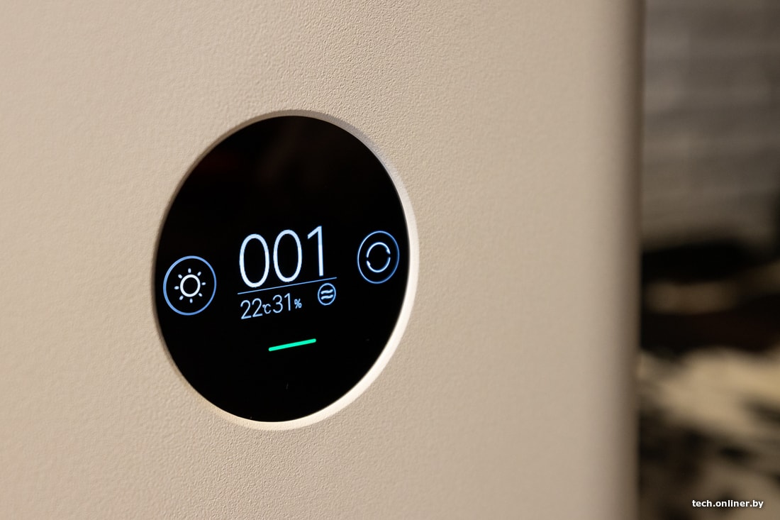 Очиститель устроен максимально просто: воздух втягивается, проходит через фильтр с тремя ступенями очистки, и затем свежий воздух выходит сверху. Круглый дисплей сенсорный, вполне отзывчивый при касаниях и информативный. Девайс даже можно подключить к Wi-Fi и организовать управление через приложение на смартфоне.