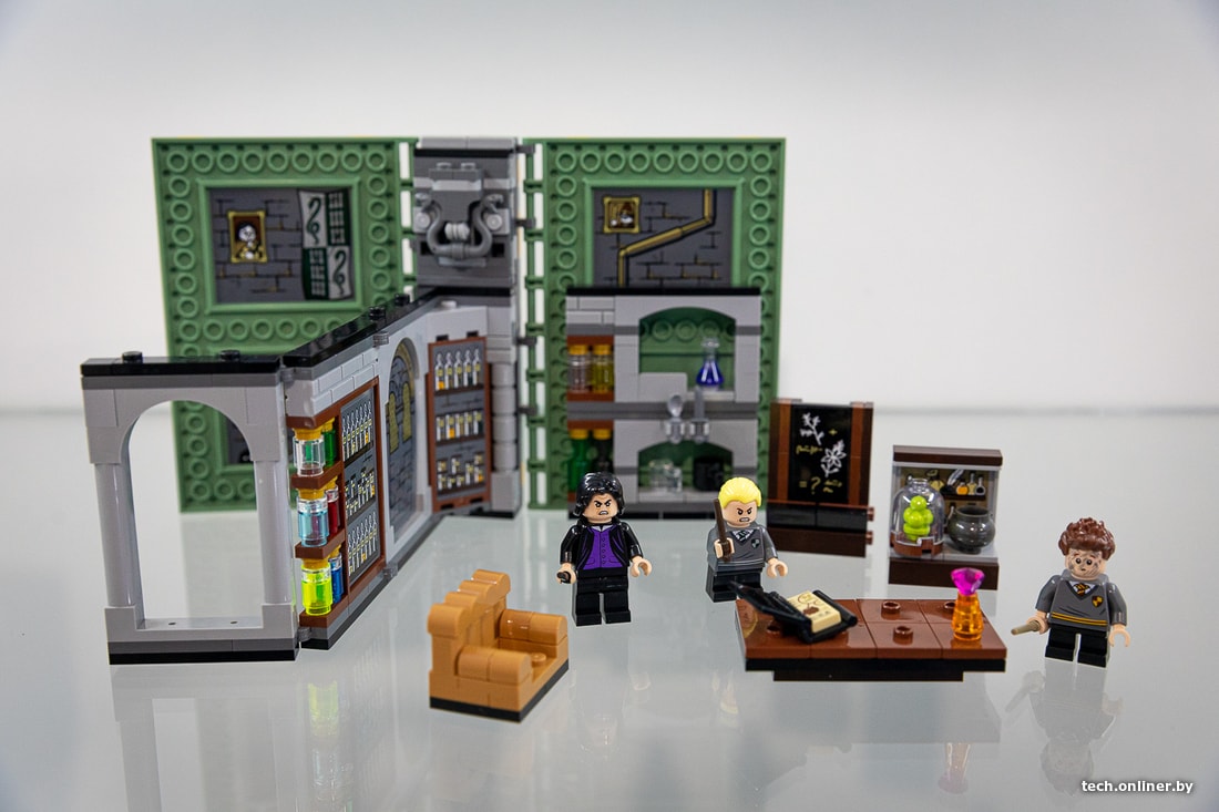«Замок Хогвартс» был самым большим набором в первой линейке — 682 детали. Стоил он на тот момент 90 долларов. Замок состоял из четырех построек: Большой зал, Совятня, ворота с волшебными лодками для первокурсников и самая высокая часть набора — башня Гриффиндора. Все помещения в замке полны настоящих секретов и тайников. Подвижные статуи, рычаги с цепями, потайные ключи и сокровища в сундуках. На входе в гостиную Гриффиндора вращающаяся картина с Полной Дамой. Напишите в комментариях пароль из первого фильма, если помните.