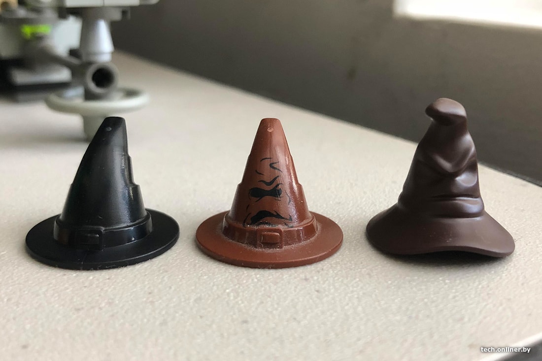 Как и многие другие наборы Lego, первый «Гарри Поттер» был очень простым по исполнению. Речь не только о принтах и эмоциях на фигурках. Вот несколько примеров. Первая распределяющая шляпа была обычным головным убором ведьмы, использовавшимся в этом амплуа с 1997 по 2013 год в различных тематических наборах. Бумажная крыша на хижине Хагрида (4707) и вовсе крепилась с помощью резинки. А волшебная палочка у персонажей — стандартная деталь (Lego Bar 4L). В желтой руке маленькой фигурки она выглядит как дубина.