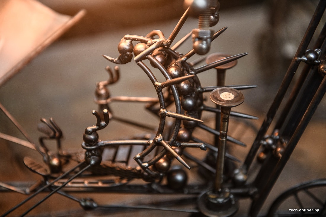 — Вот это сложно (показывает на ВАЛЛ-И. — Прим. Onliner) — потому что он 25-й. Я от них устал, надо сделать перерыв. Сергей Михайлович делал маленьких Бендеров — то же самое, на 10-м утомился. А вот сделать что-то новое — это не сложно. «Дайте, я сейчас все забомблю, не пойду домой, буду варить». Были предложения делать много «велосипедов» — условно 10 штук в неделю. И цена хорошая, и вроде есть чем заняться. А потом прикидываешь: это, раз уж подписался, на год вперед. «Да ну нафиг!» (смеется. — Прим. Onliner) Долго и одно и то же — не наш вариант. Интересны абсолютно творческие заказы, прикольные, с юморцом. Что-то находить, предлагать.