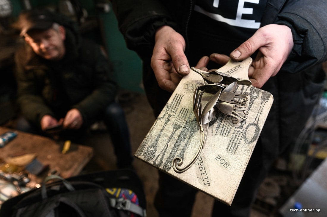 — Я вот в той каморке сидел один, пришел товарищ: «А можно я тоже буду?» Говорю: можно. Потом пришел Сергей Михалыч, кузнец: «А давай?» Давай! Получилось, что нас трое. Тогда и переехали: втроем в первой мастерской не помещались. Логотип — как у Mercedes (смеется. — Прим. Onliner).