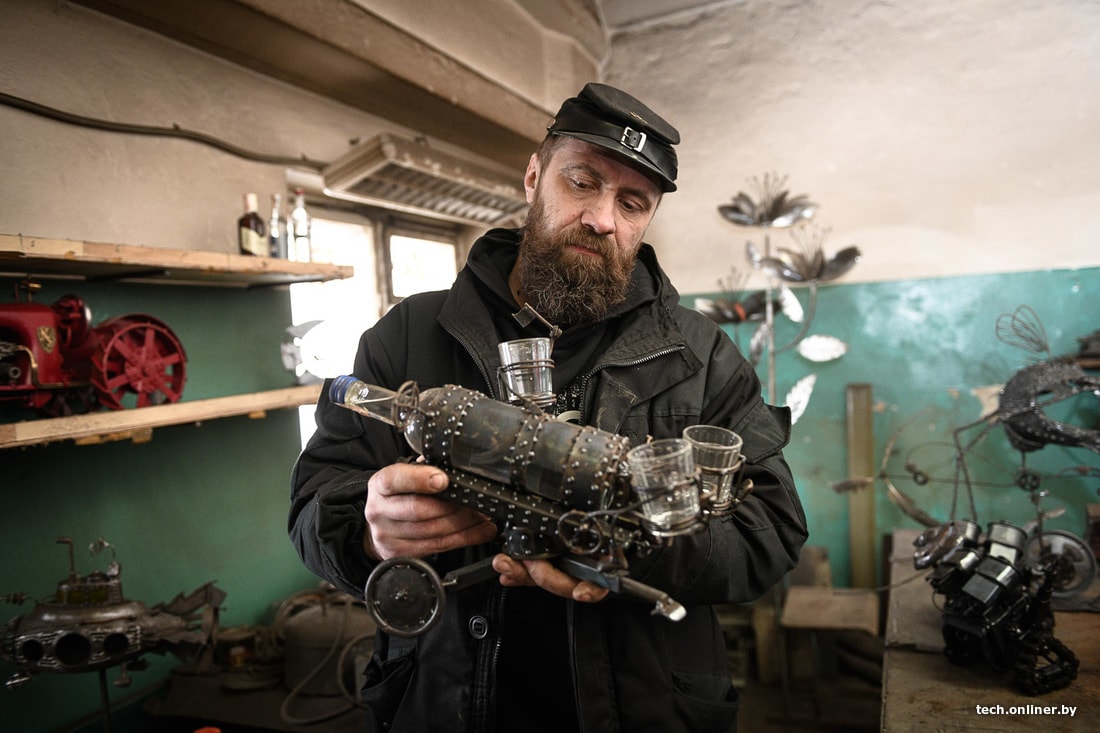 — У нас в мастерской Сергей Михалыч любит очень ругательное слово «лофт». Вот табуретка (показывает на стоящую рядом табуретку на металлических ножках и с деревянным «седлом». — Прим. Onliner) — «лофт». В магазине, поди, стоила бы рублей 100—120. А такой «лофт» можно отгружать тоннами. Такая же ерунда со стимпанком. Мне больше нравится слово «металл-арт». Этим все сказано.