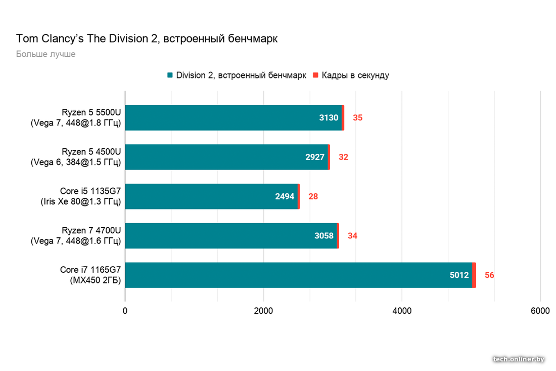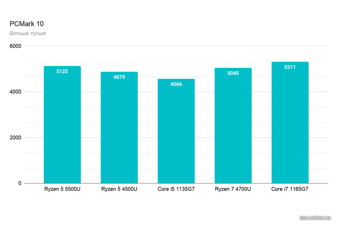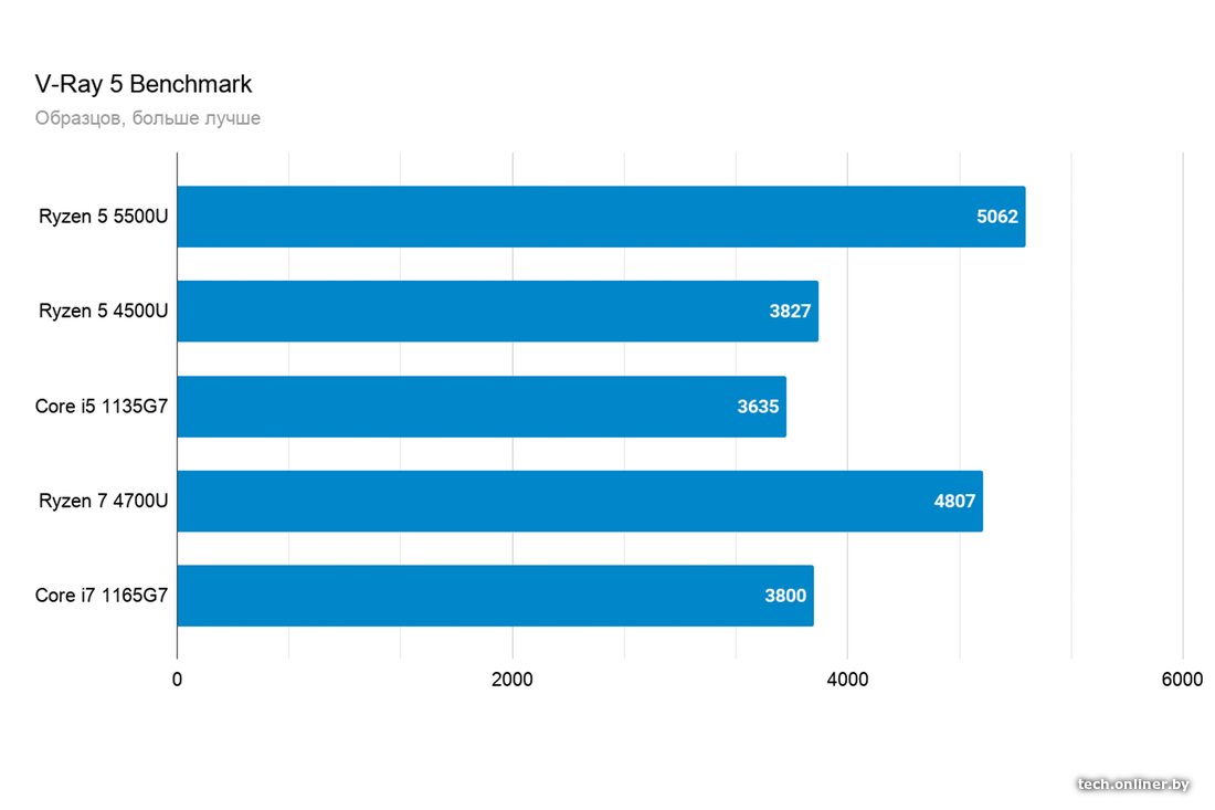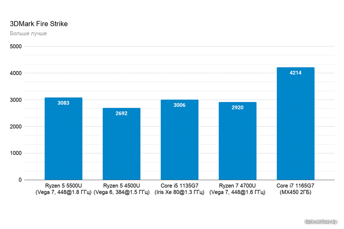 Новому процессору Ryzen 5 5500u добавили одно ядро графики и подняли частоту на 100 МГц по сравнению с предшественником Ryzen 4 4500u. Обновление сказалось на результатах: во всех тестах встроенная графика нового процессора ожидаемо оказалась лучше. В синтетике и в играх новый процессор также опережает Ryzen 7 4700u, пусть и незначительно.