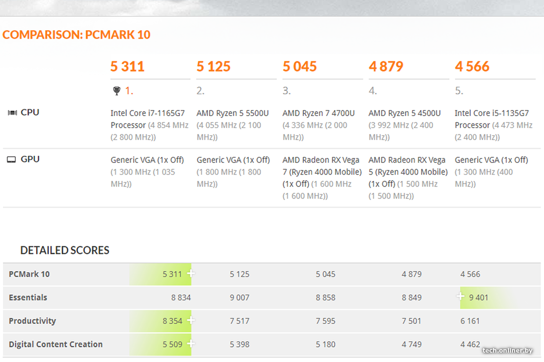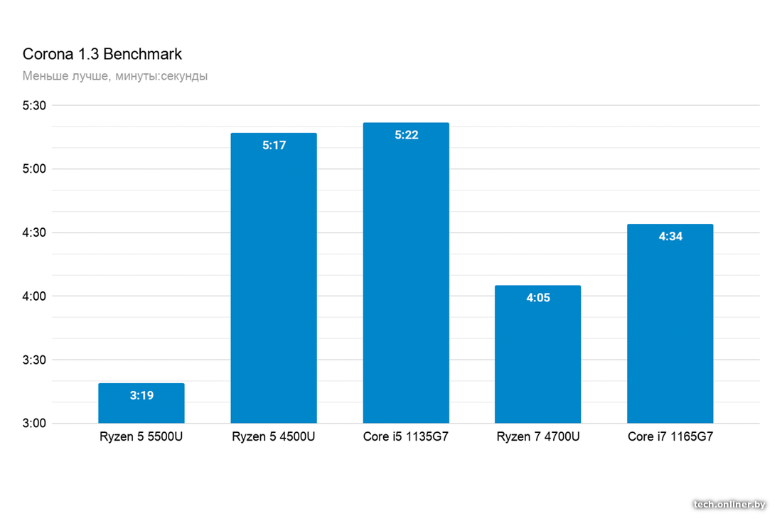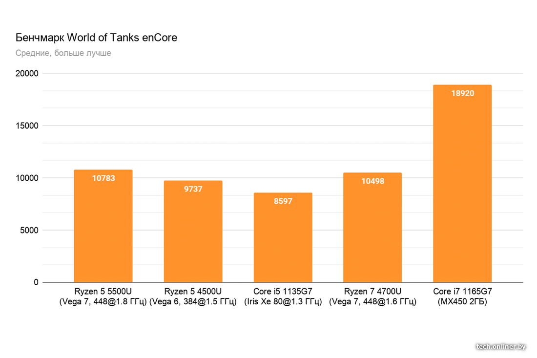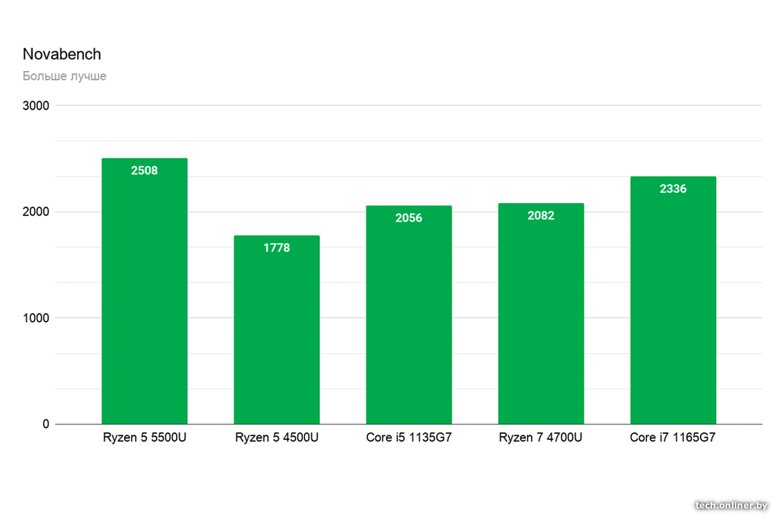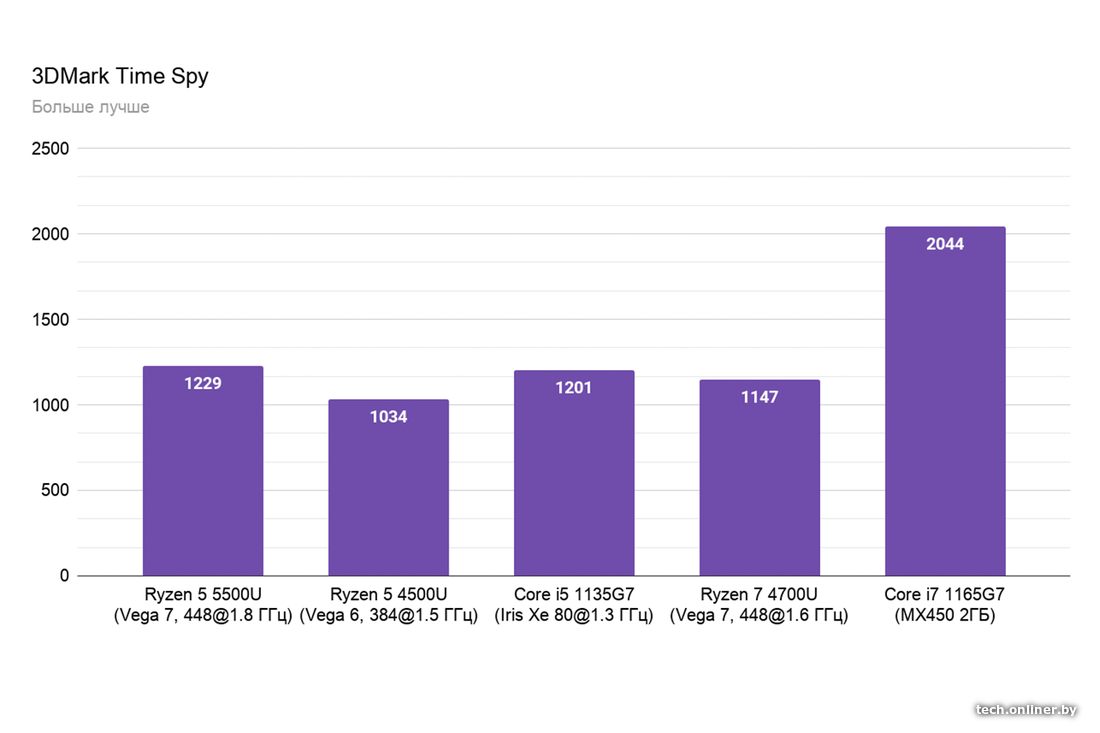 Новому процессору Ryzen 5 5500u добавили одно ядро графики и подняли частоту на 100 МГц по сравнению с предшественником Ryzen 4 4500u. Обновление сказалось на результатах: во всех тестах встроенная графика нового процессора ожидаемо оказалась лучше. В синтетике и в играх новый процессор также опережает Ryzen 7 4700u, пусть и незначительно.