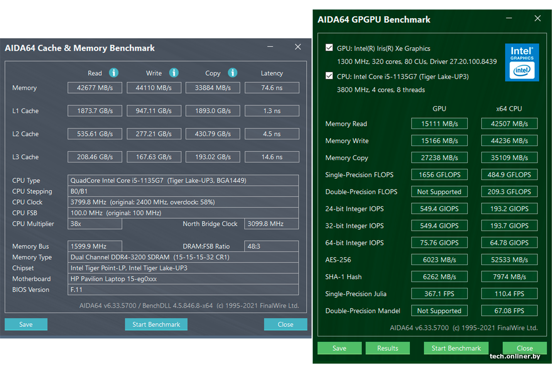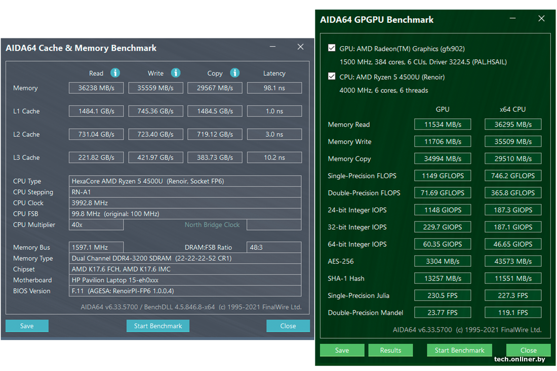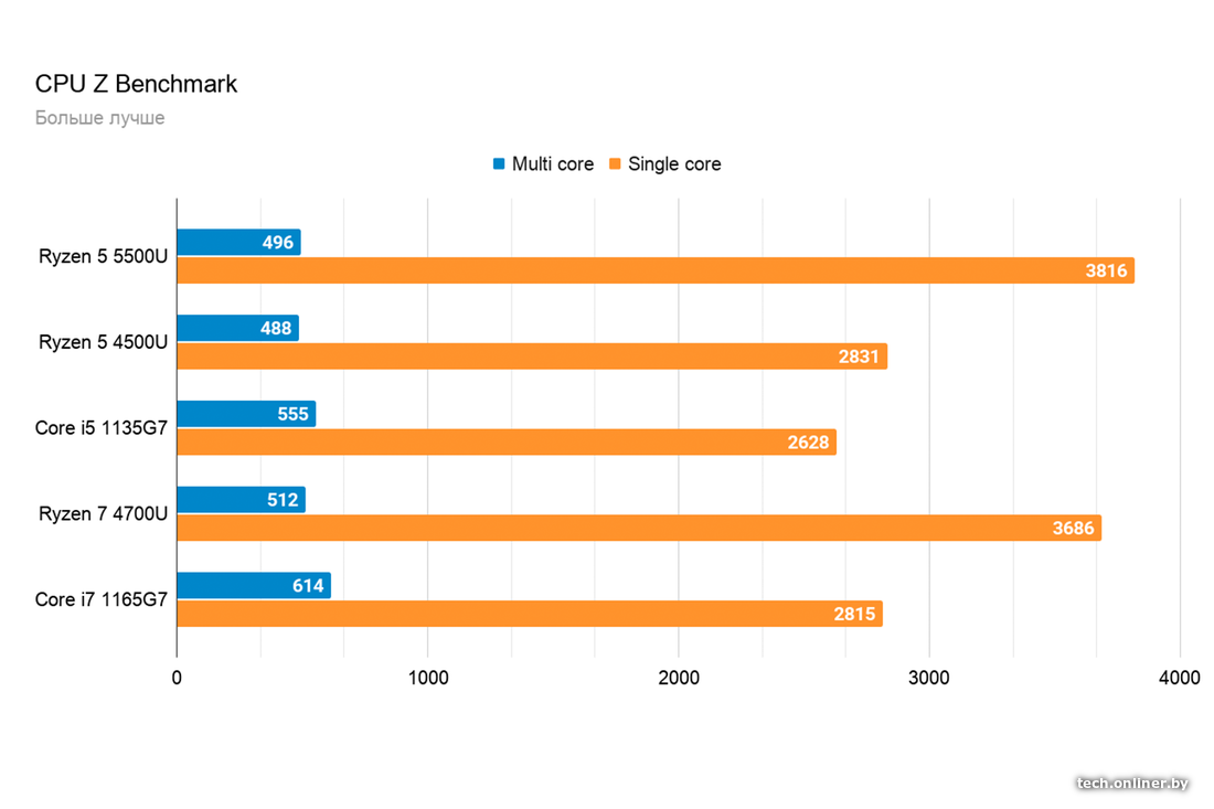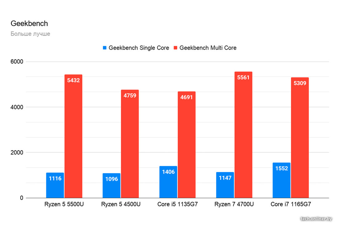 Синтетические тесты показали преимущество ноутбука на новом Ryzen 5 5500u. В тесте Cinebench R23 с загрузкой всех ядер он набрал на 40% больше баллов, чем конкурент на Core i5, и на 31% больше, чем Core i7. Ноутбуки на прошлогодних процессорах AMD Ryzen 5 и 7 также оказались слабее новинки в Cinebench R23. Зато в одноядерных тестах процессоры Intel набрали больше баллов, чем все AMD. Так, Core i7 был быстрее нового Ryzen на 21% в Cinebench R23, на 19% — в бенчмарке CPU-Z и на 28% — в Geekbench.