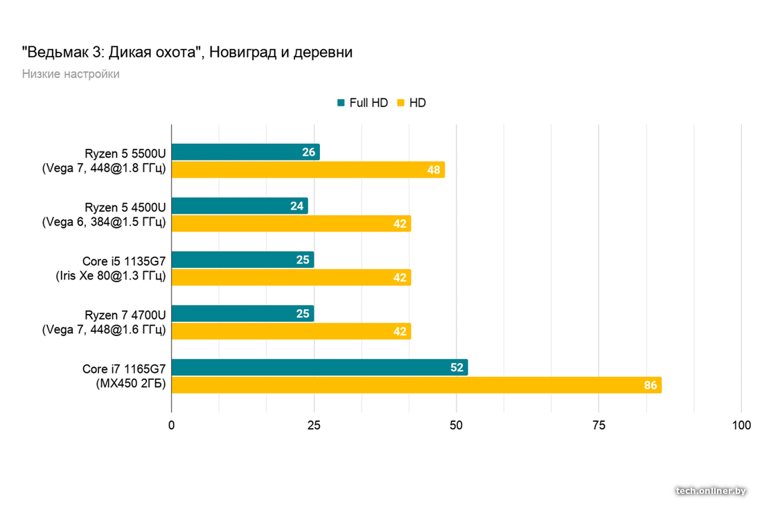 Во что можно поиграть? На всех ноутбуках со встройкой можно уверенно играть в мультиплеерные игры на низких настройках, а в некоторые, например World of Tanks, даже на средних. Дискретная графика уже дает чуть больше возможностей, но о запуске новых крупных игр по-прежнему речь пока не идет. А вот старые игры вроде любимого «Ведьмака 3» на низких настройках порадуют стабильным высоким фреймрейтом даже на встроенной графике.