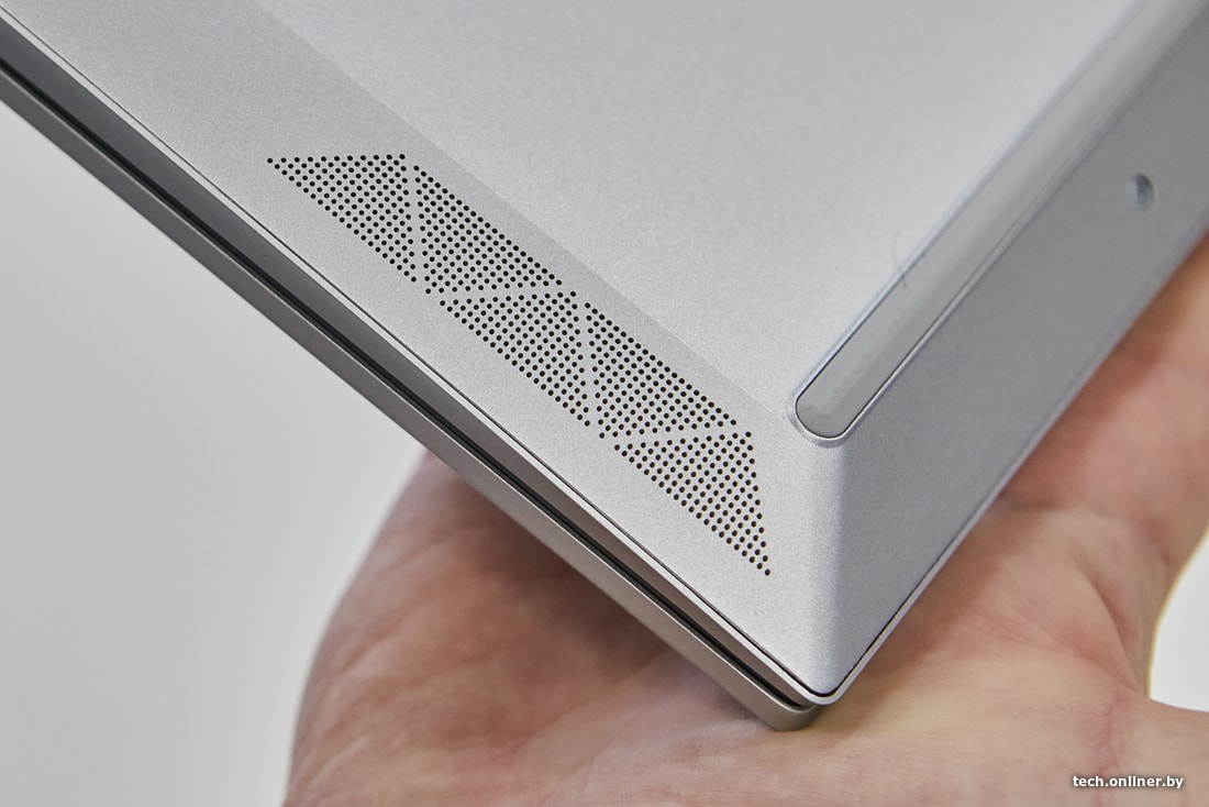 Выглядят ноутбуки субъективно очень хорошо. Все боковые грани с красивым прогибом, а низ — в виде скошенной пирамидки. У них тонкие рамки экрана и слегка утопленная в корпусе клавиатура, которая приподнимается на пару миллиметров при открытии крышки Специальные упоры для этого действия сделаны из пластика.