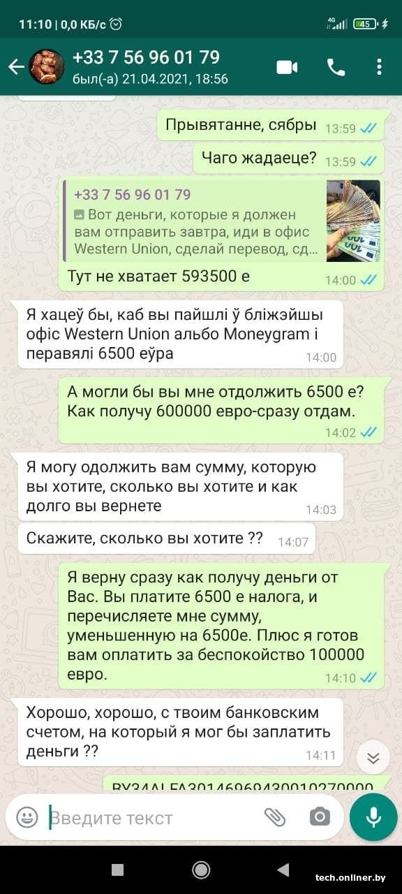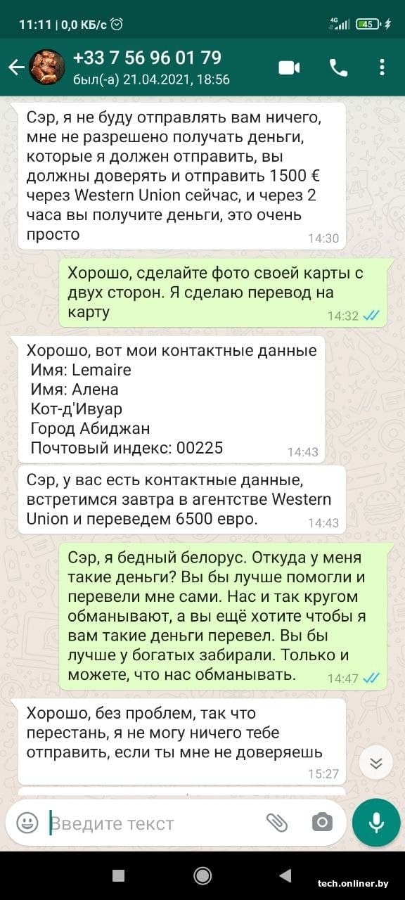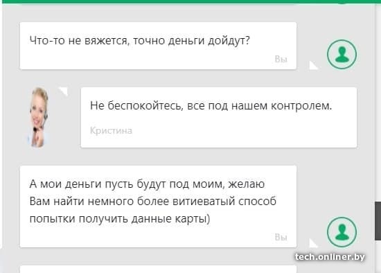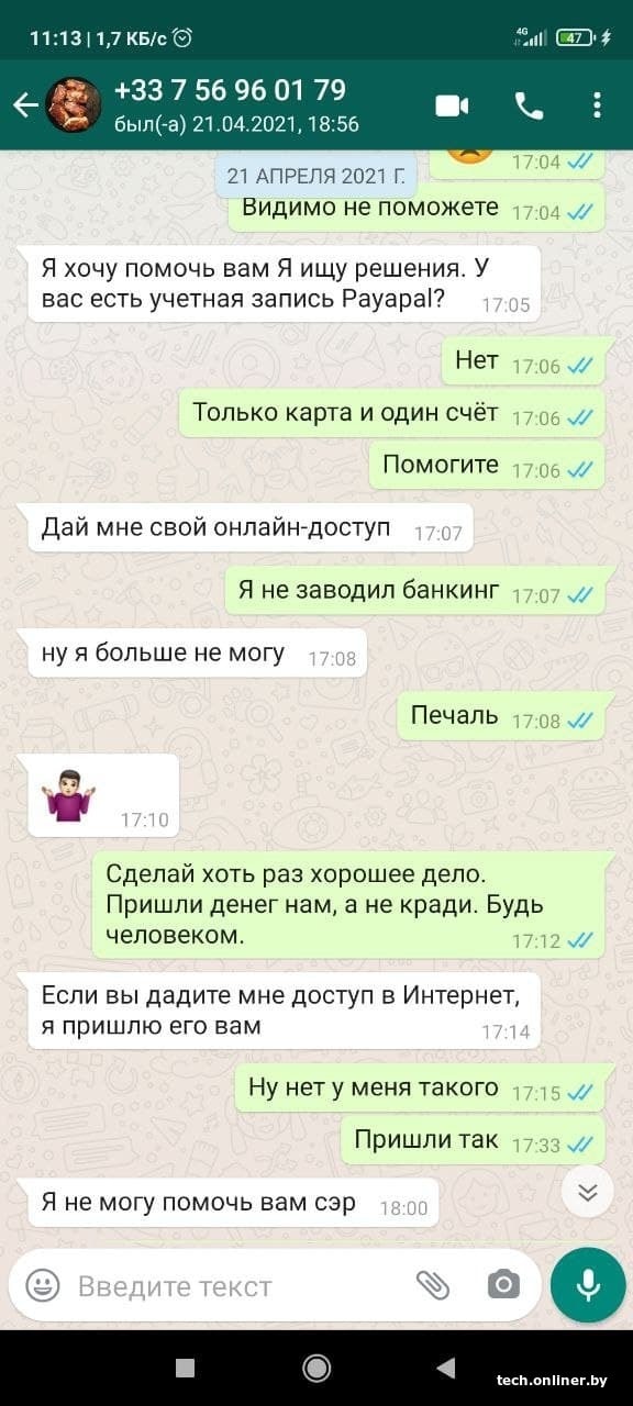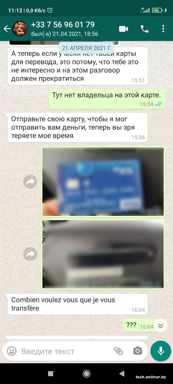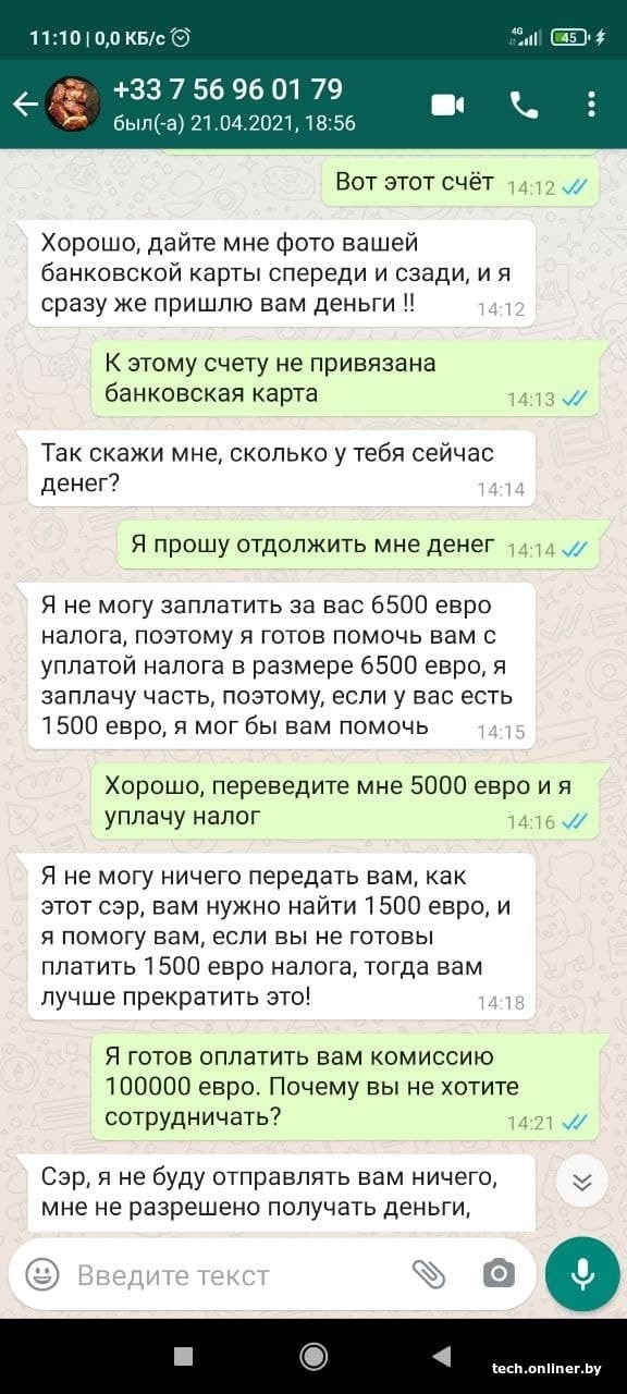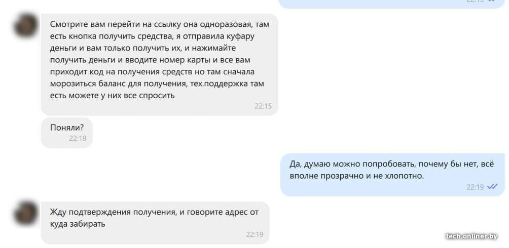 От одного из таких поступило предложение: поучаствовать в опасной схеме. Забавно, что сообщение от нового «дельца» в мессенджер было отправлено с того же номера телефона (одного из белорусских сотовых операторов), которым пользовался предыдущий разговорчивый мошенник. Сказал, что приобрел номер на одном из форумов в даркнете: «Очень просил наоткрывать [банковских] карт и предоставить ему в качестве „прокладок“ при выводе денег. На вопрос, что делать, если ко мне придут, предложил сказать милиции, что карты потерял».