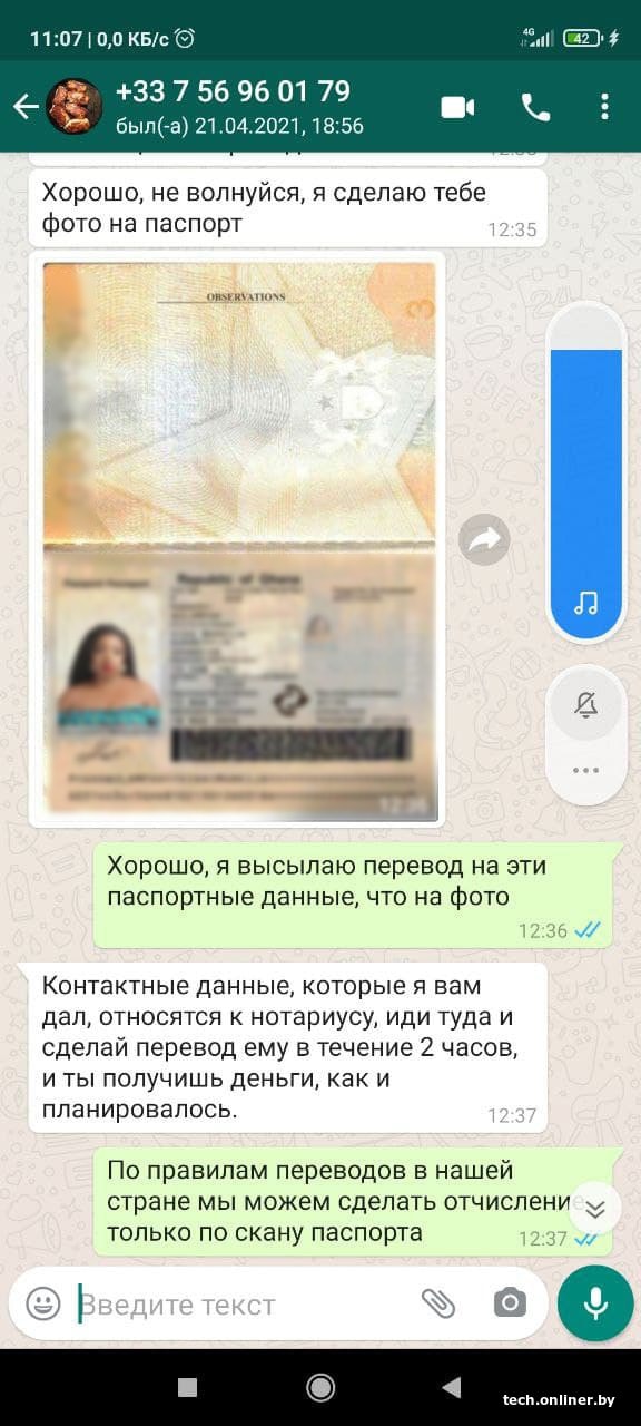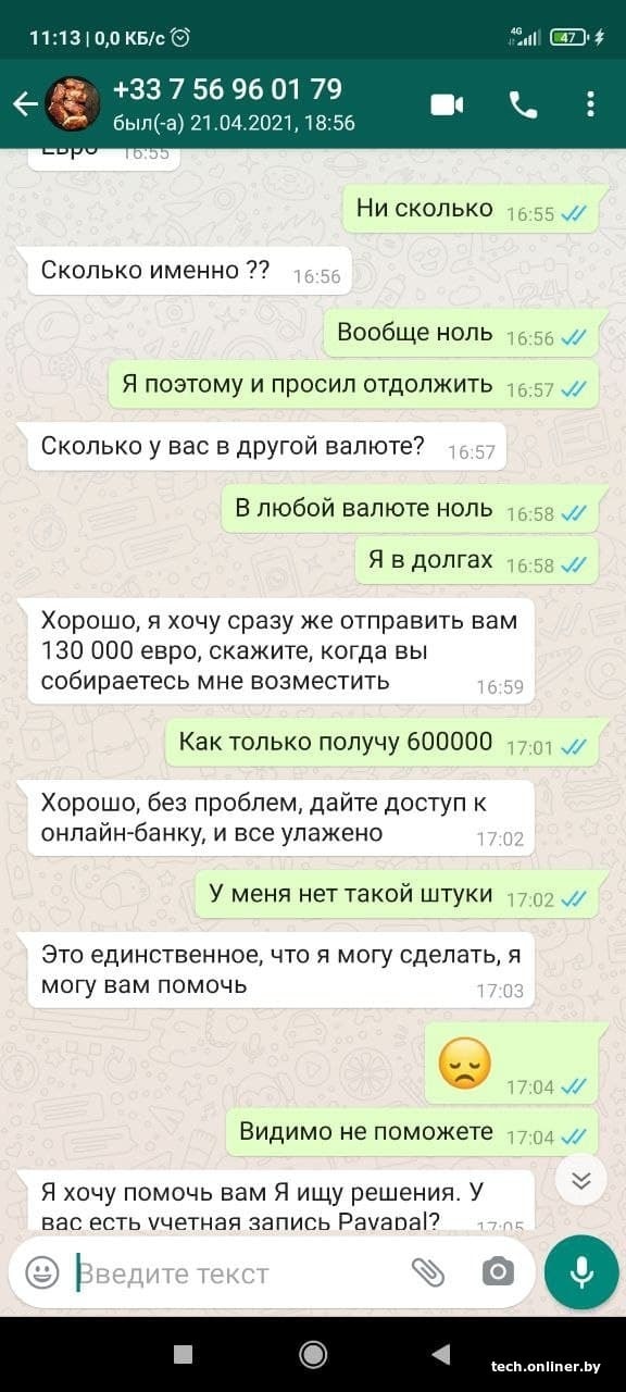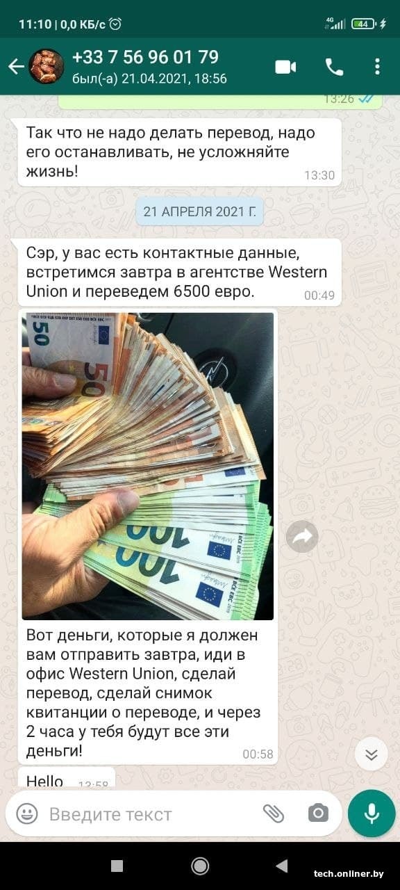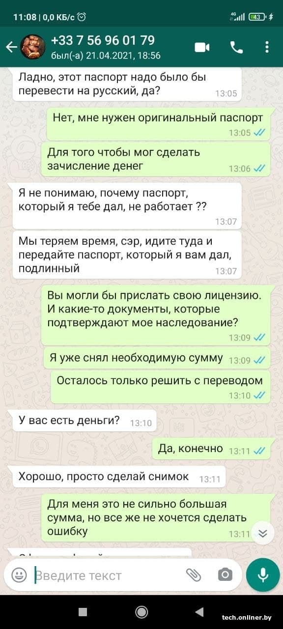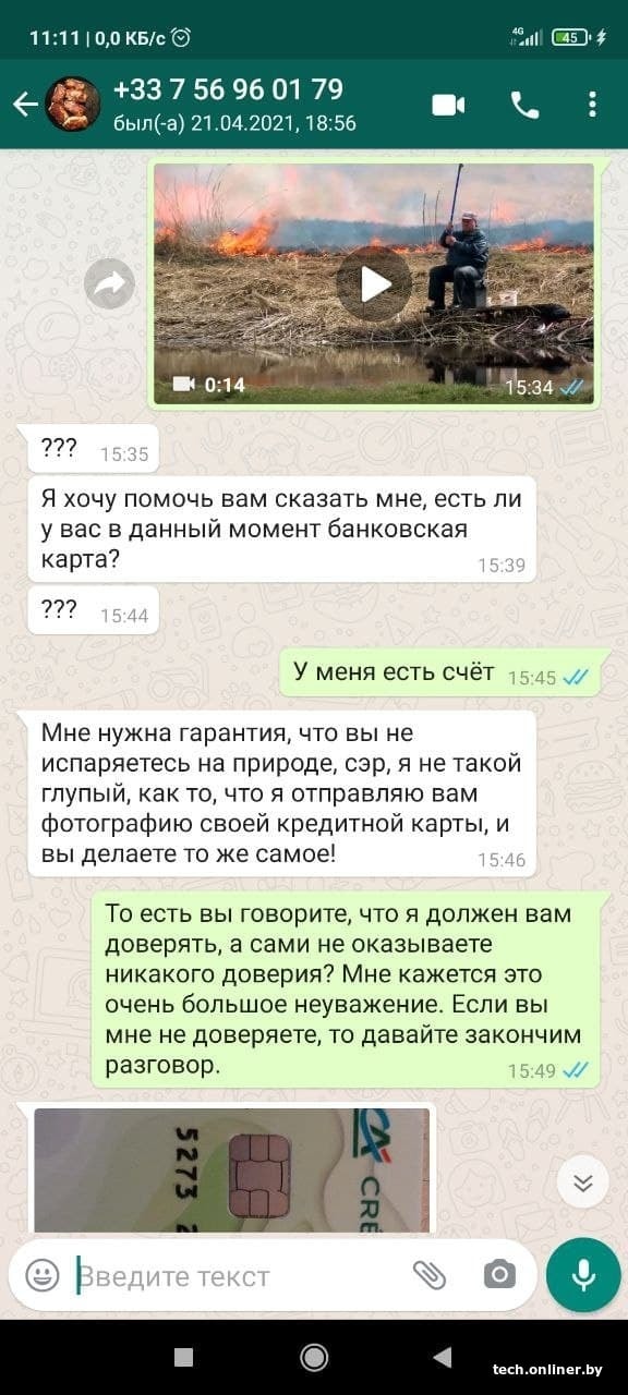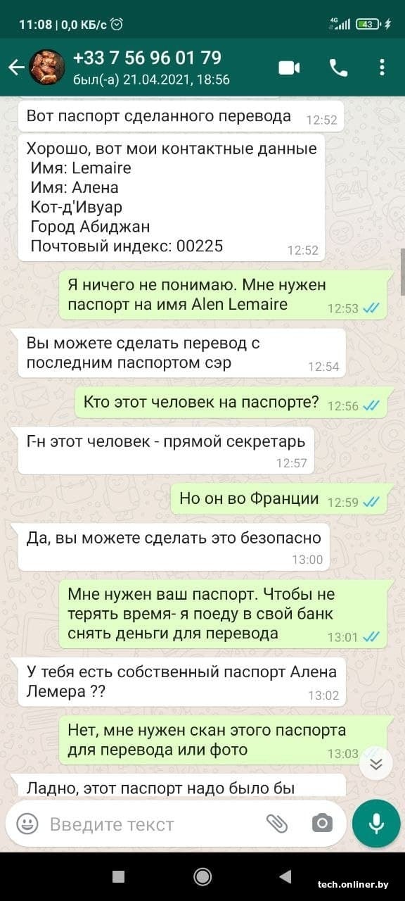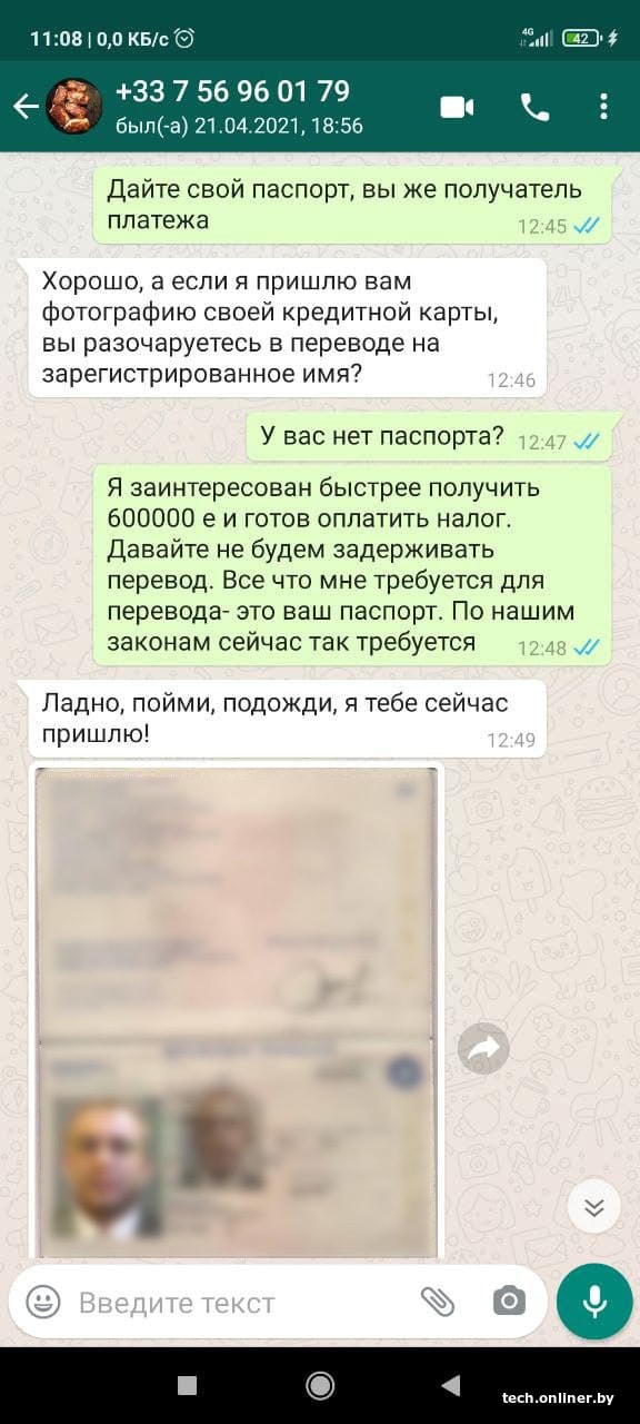 От одного из таких поступило предложение: поучаствовать в опасной схеме. Забавно, что сообщение от нового «дельца» в мессенджер было отправлено с того же номера телефона (одного из белорусских сотовых операторов), которым пользовался предыдущий разговорчивый мошенник. Сказал, что приобрел номер на одном из форумов в даркнете: «Очень просил наоткрывать [банковских] карт и предоставить ему в качестве „прокладок“ при выводе денег. На вопрос, что делать, если ко мне придут, предложил сказать милиции, что карты потерял».