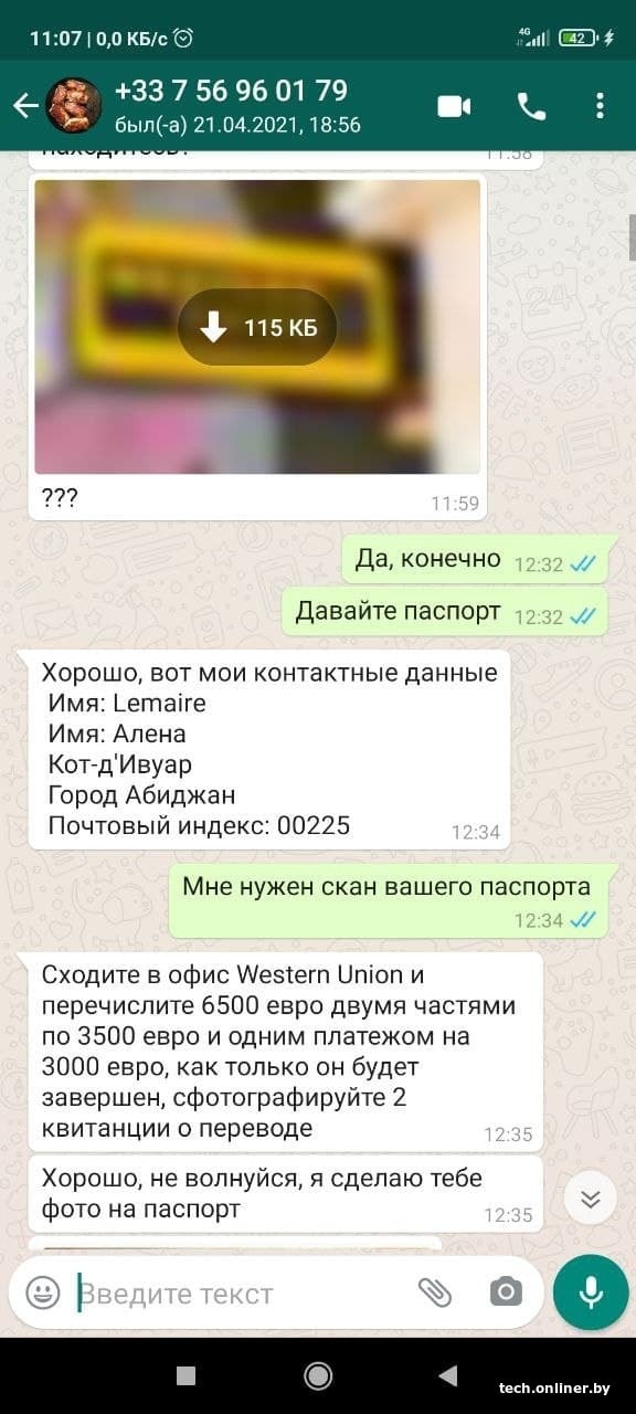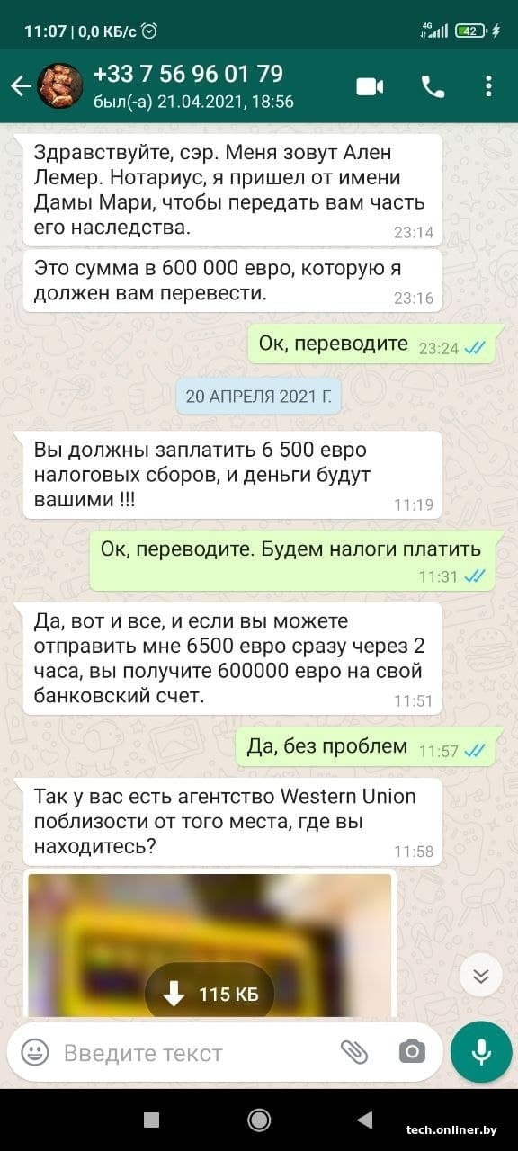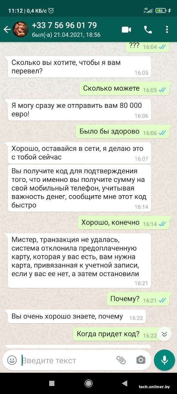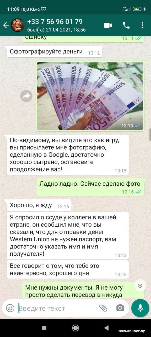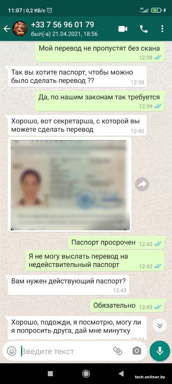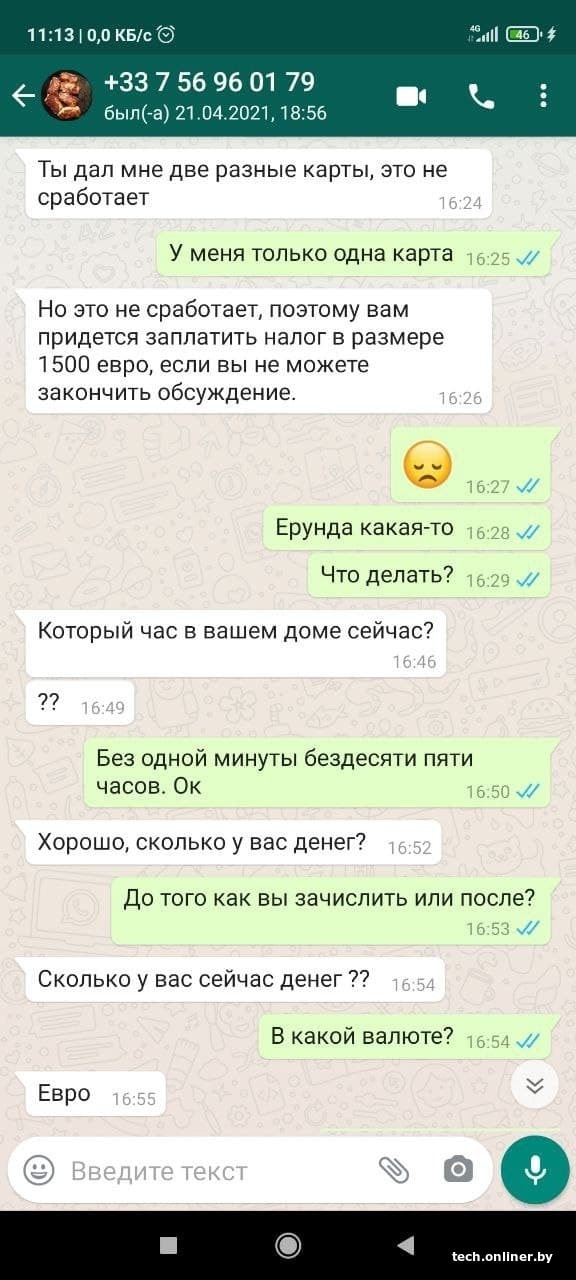 От одного из таких поступило предложение: поучаствовать в опасной схеме. Забавно, что сообщение от нового «дельца» в мессенджер было отправлено с того же номера телефона (одного из белорусских сотовых операторов), которым пользовался предыдущий разговорчивый мошенник. Сказал, что приобрел номер на одном из форумов в даркнете: «Очень просил наоткрывать [банковских] карт и предоставить ему в качестве „прокладок“ при выводе денег. На вопрос, что делать, если ко мне придут, предложил сказать милиции, что карты потерял».
