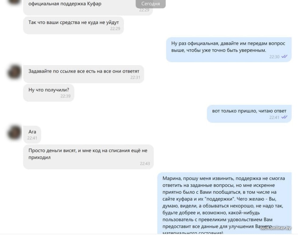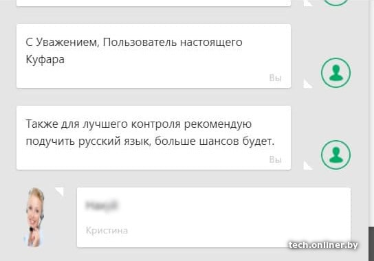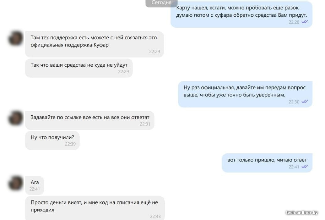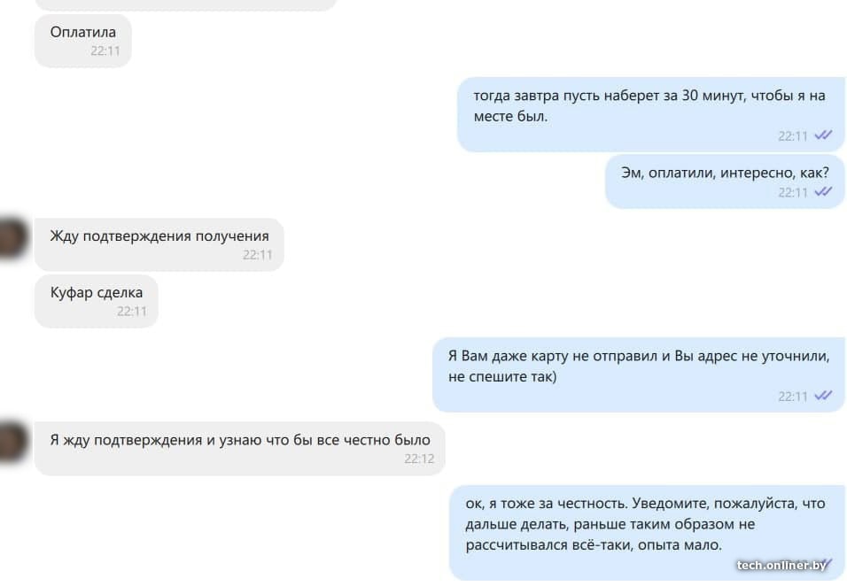 В «Куфаре» Onliner напомнили, что постоянно просят своих пользователей через e-mail, push-рассылки и баннеры на сайте не общаться с незнакомцами в мессенджерах, и вести переписку о сделках непосредственно на площадке. Это позволяет блокировать потенциально вредоносные ссылки, а также пользователей, которые пытаются их рассылать.