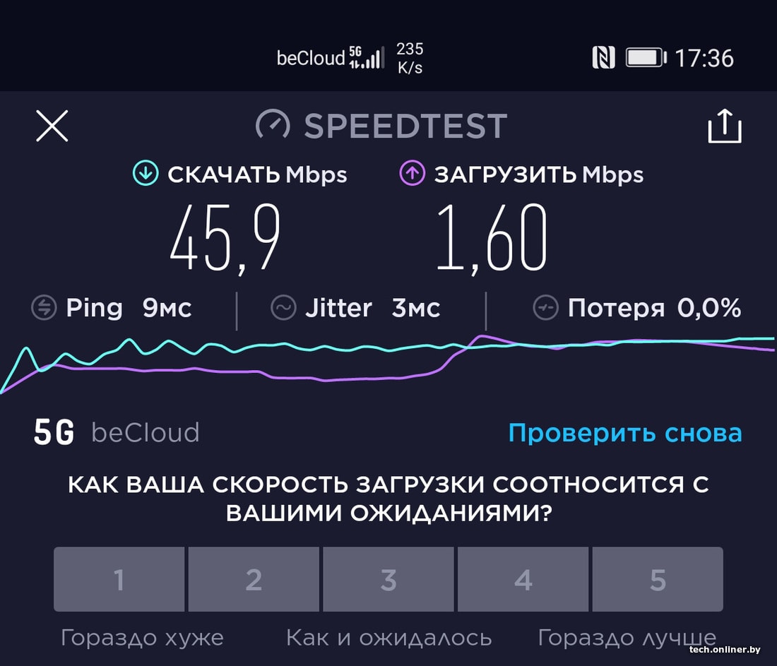 В чем нюанс этого тестирования? Замеры происходят в пустой сети, где нет других пользователей. По этой причине вне зависимости от того, какой значок высвечивается на смартфоне, LTE или 5G, скорость передачи данных будет высокой (кроме того, агрегирование трех и более частот — 800, 1800  и 2600 — в LTE можно получить скорость, близкую к гигабиту, но не в нашем случае). Ниже приводим несколько скриншотов с замерами, не всегда это 5G, но скорости куда выше «элтешных».