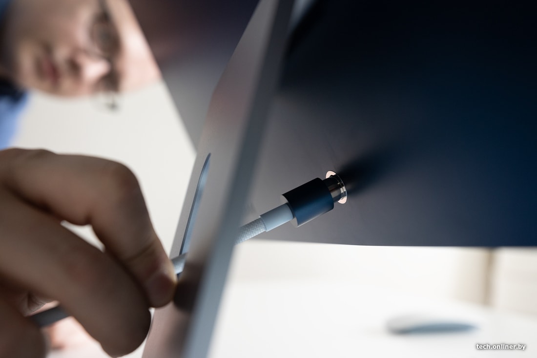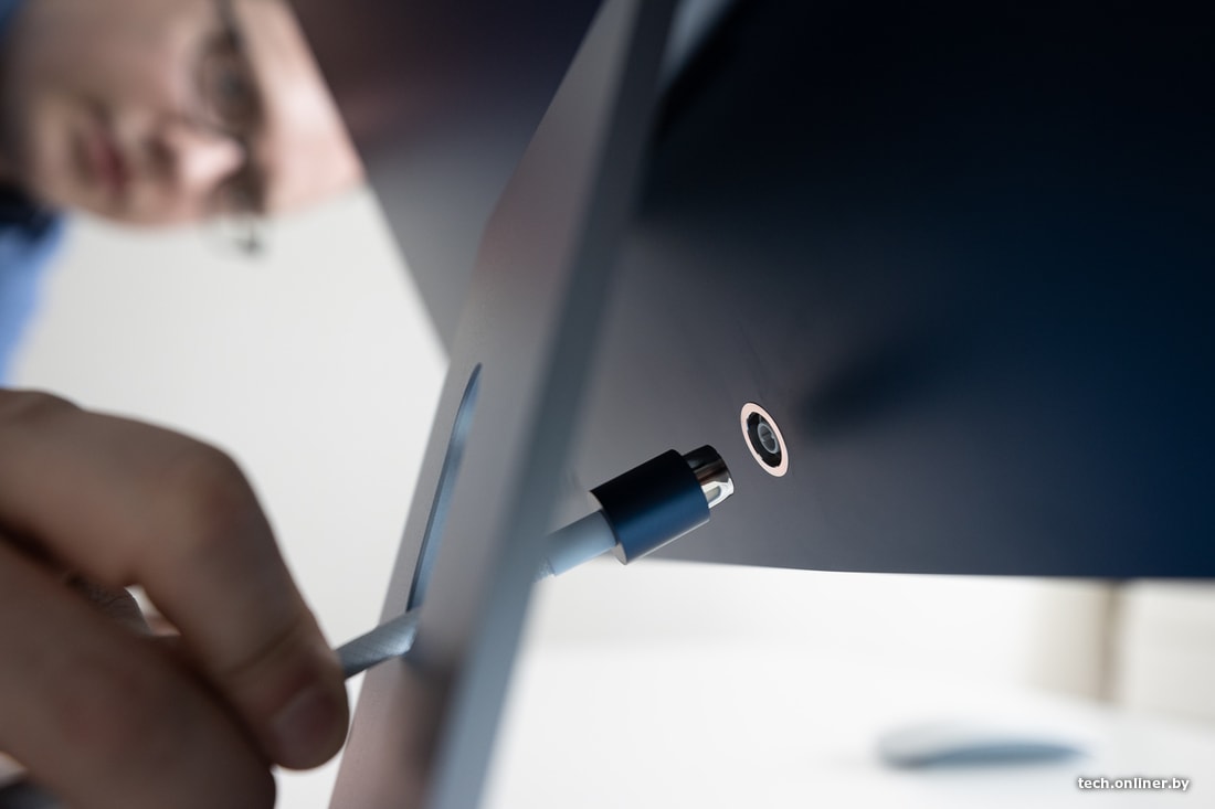 На задней крышке нашего iMac четыре порта: два USB 3 (до 10 Гбит/с) и два USB 4, они же Thunderbolt 3 (до 40 Гбит/с). В базовой модификации будут только два Thunderbolt, и все — никаких USB 3 и гигабитного Ethernet, который, к слову, вынесен на блок питания.