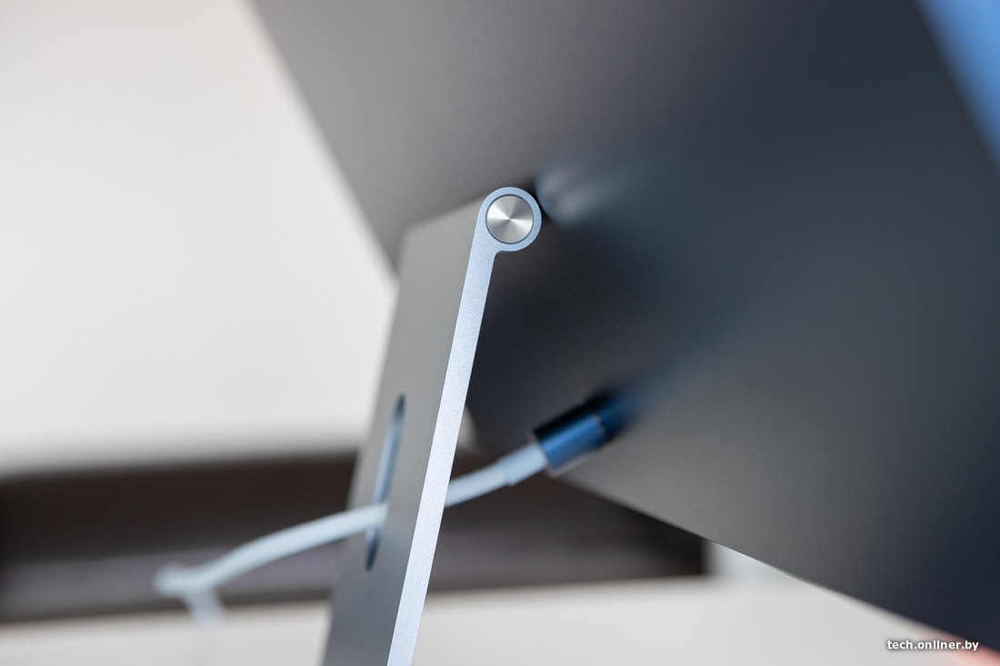 В новом поколении моноблок предлагается сразу в семи цветах: классический серебристый, а также желтый, оранжевый, красный, зеленый, фиолетовый и синий. Нам достался синий, и при виде насыщенного темного цвета задней крышки казалось, что это будет просто нечто. Но подставка оказалась уже другого, более светлого оттенка с уклоном в серый.