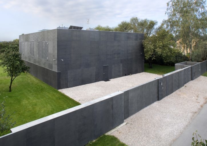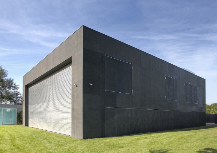 Постройка дома заняла три года, он был завершен в 2008-м. Участок огорожен двухметровым забором с электронными системами слежения, ставни (если можно назвать так массивные плиты) на окнах выглядят тотально непробиваемыми, одна из стен выдвигается, открывая светлый интерьер.