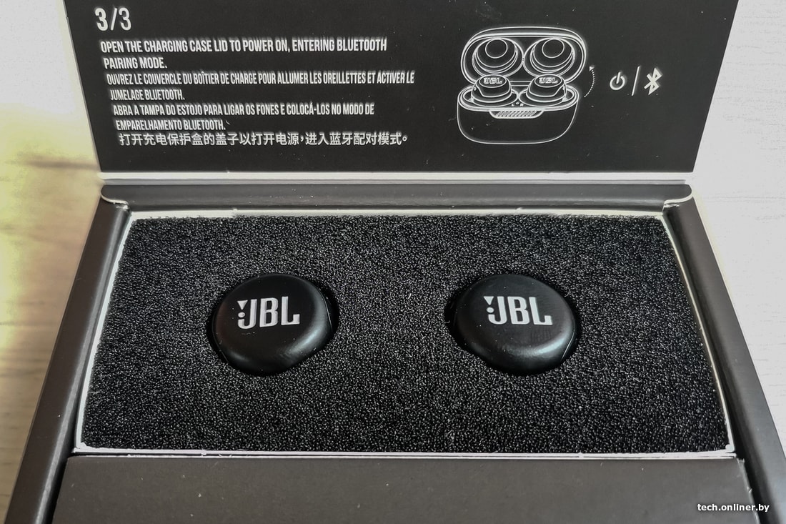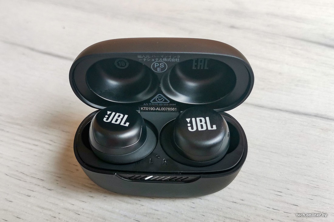 Самая богатая упаковка. От нее так и веет фирменным бархатным звучанием JBL. Кейс по компактности может соперничать с чехлом для Galaxy Buds Live, однако он другой формы, наушники же упакованы отдельно. В коробке мы также нашли несколько томиков «юзермануалов» и другой бумаги, отдельную коробочку для двух пар амбушюров разных размеров и пару колец-держателей, а также кабель зарядки.