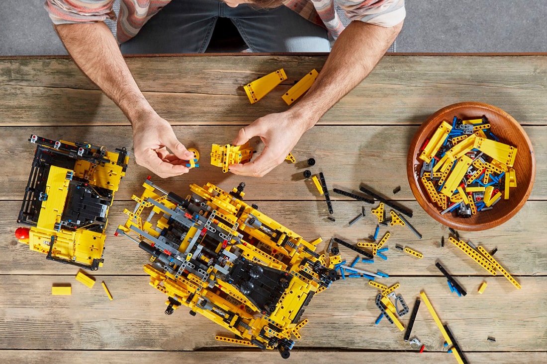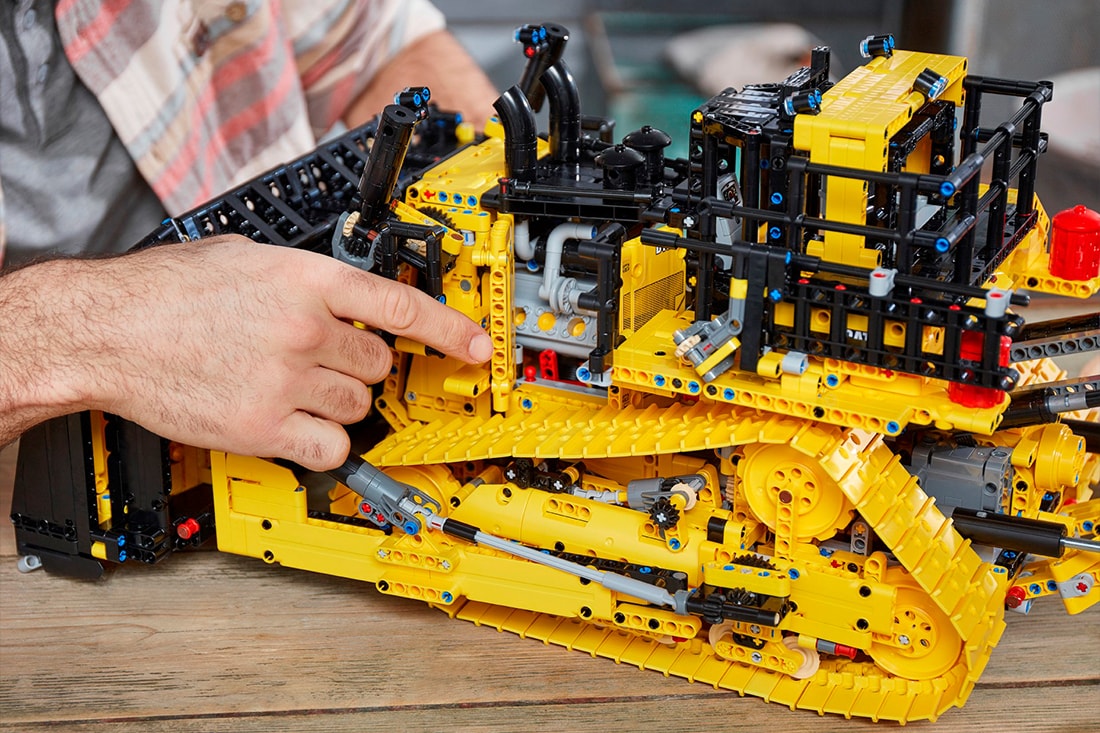 Топовый набор LEGO Technic 2021 года — копийная модель мощного бульдозера Cat D11 (3854 детали). Дистанционное управление отвалом, рыхлителем и лестницей, четыре мотора, сложная коробка передач, шесть черных актуаторов среднего размера, гусеницы с изменяемым натяжением — в целом огромная яркая модель и отличное украшение коллекции. При этом бульдозер на 200 рублей дороже, чем знаменитый экскаватор Liebherr, у которого семь моторов, два хаба и 4000 деталей.