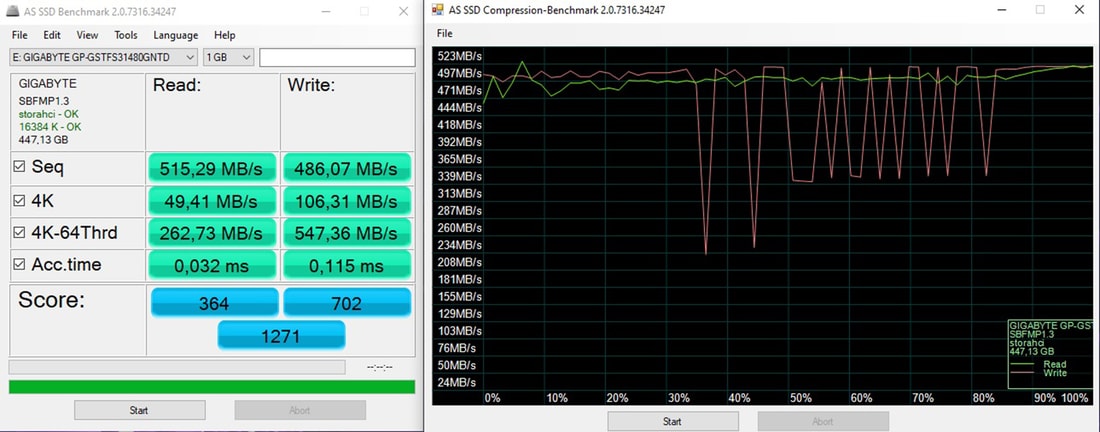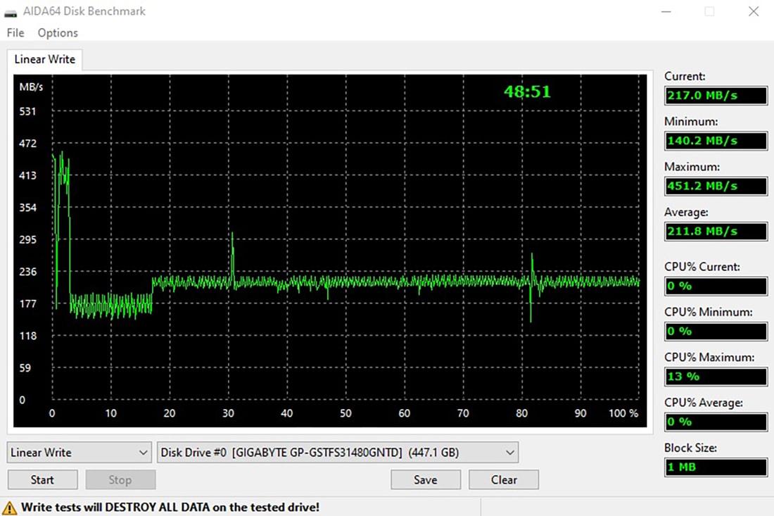 Gigabyte 480GB GP-GSTFS31480GNTD — размер SLC-кеша типичен для дисков на базе Phison PS3111-S11 и составляет менее 5%, в которые данные пишутся с максимальной скоростью. После заполнения SLC-кеша диск проваливается по записи к 140 МБ/с, после восстанавливается и до завершения тестирования пишет на скорости чуть более 200 МБ/c.