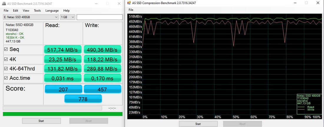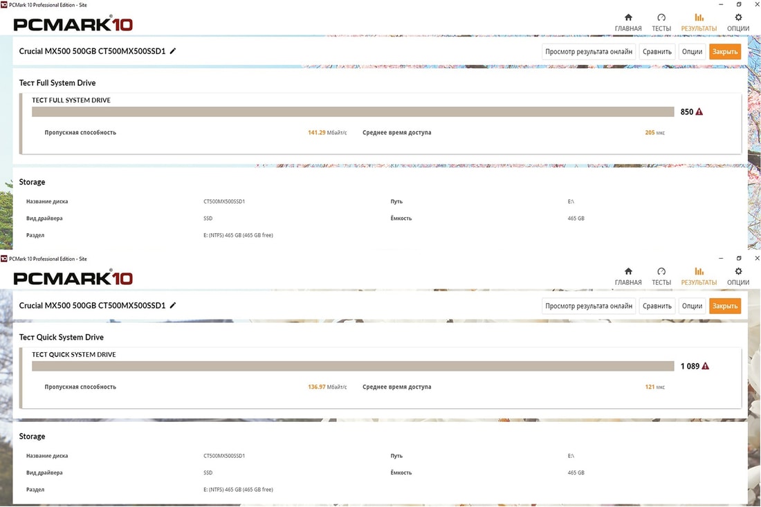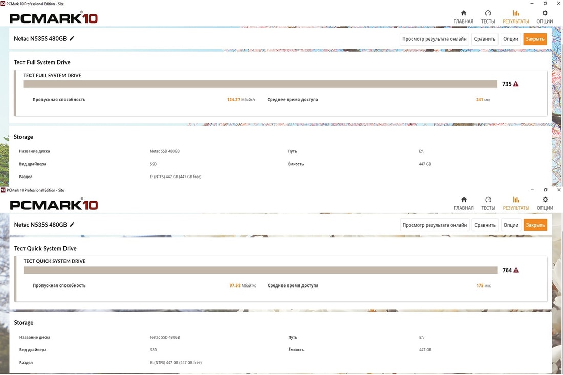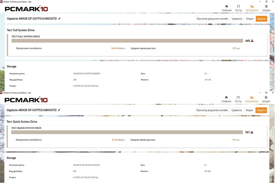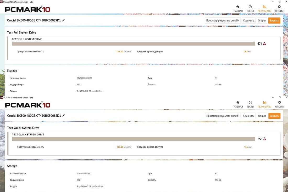 С целью удобства восприятия мы совместили скриншоты двух тестов в один. Для анализа имеют значение два параметра — общий балл и среднее время доступа. Между лучшим и худшим результатом Samsung и бюджетного Kingston A400 — пропасть. Все остальные накопители уместились друг за другом согласно качеству компонентов и ценовому позиционированию.