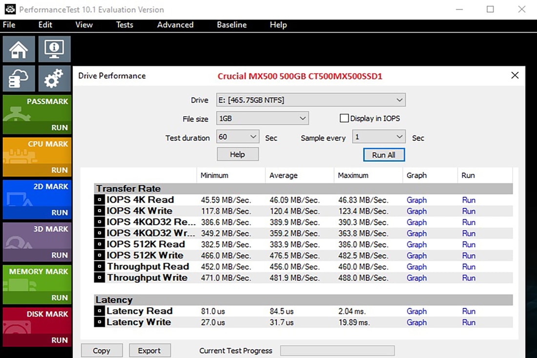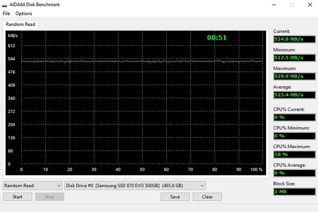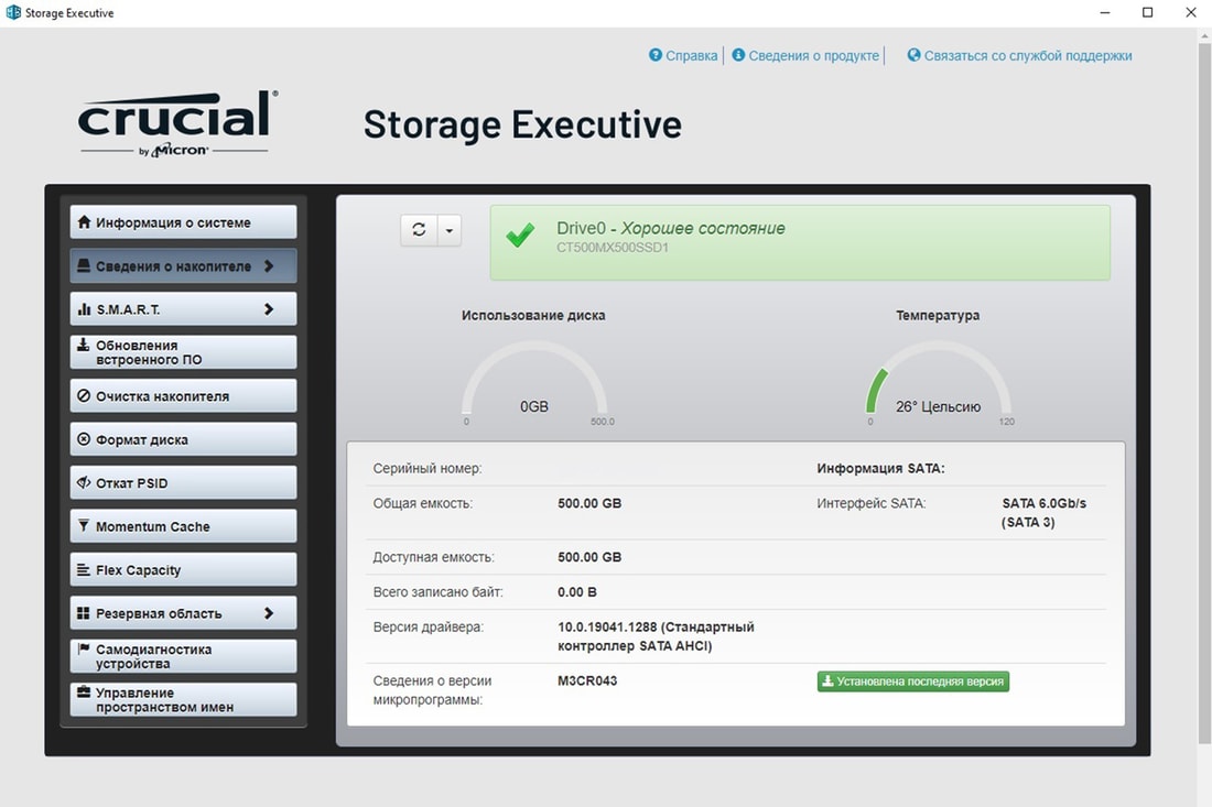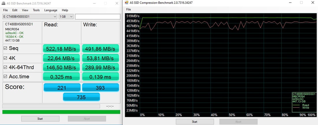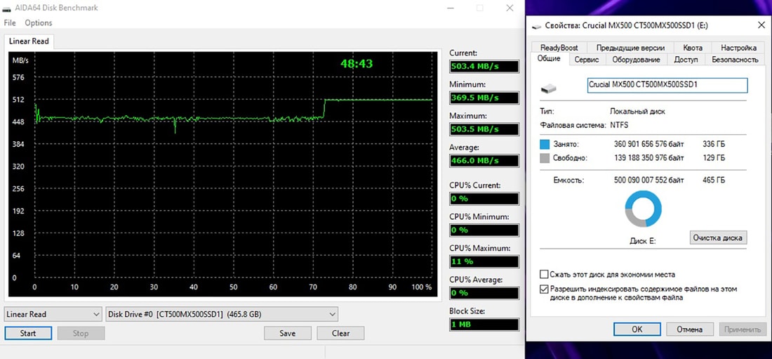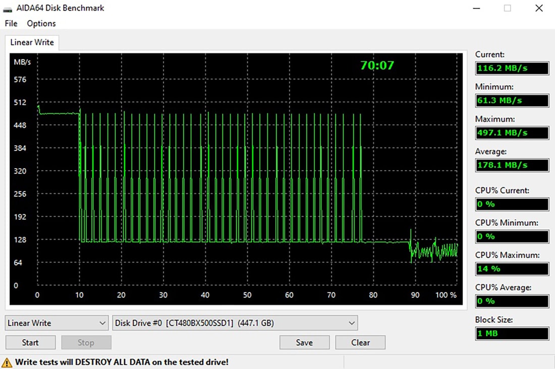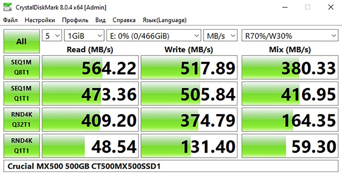 Crucial MX500 500GB CT500MX500SSD1 — пережив столько ревизий, модель кардинально сменила печатную плату, контроллер и чипы без смены названия. В актуальном исполнении 500-ГБ-модель периодически падает в районе 300 МБ/с и восстанавливается обратно к 500 МБ/с. Неплохо, но не впечатляюще.