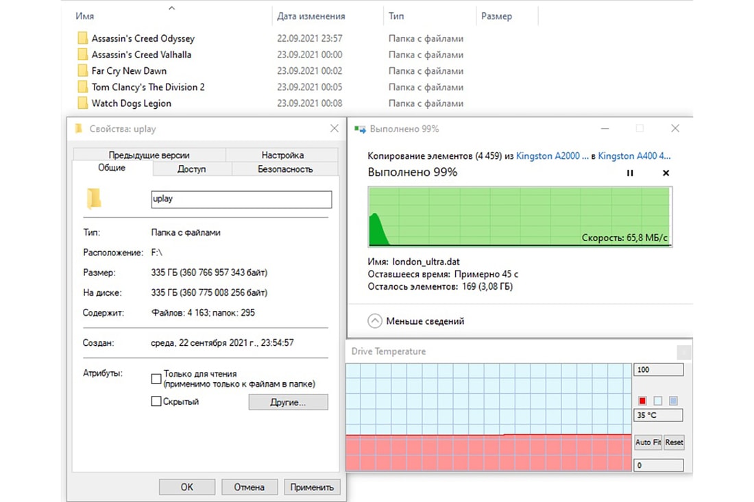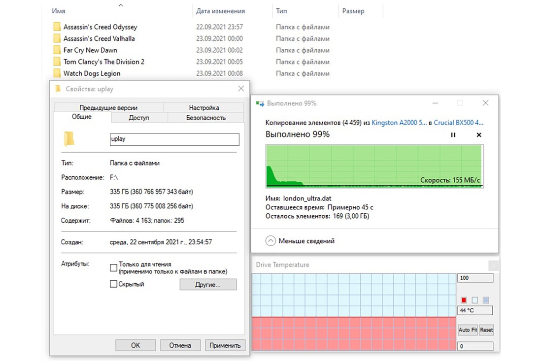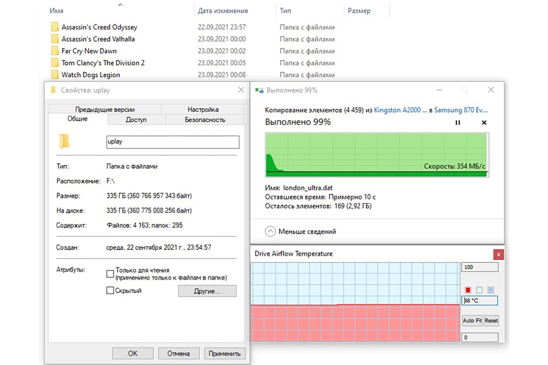 В качестве реальной нагрузки на диск мы использовали папку игр библиотеки Uplay емкостью 335 ГБ. Вполне себе реальная ситуация: вы купили диск и хотите перекинуть на него свою библиотеку игр. Поведение дисков и результаты вполне сопоставимы с линейной записью в тесте AIDA64. Разница лишь в том, что в таком режиме нам доступен софтовый мониторинг датчиков температуры, если он, конечно, есть. Диск от Gigabyte все время копирования файлов провел с залипшим датчиком и показателем в 33 градуса, аналогичное поведение и у накопителя Netac — здесь датчик также показывает постоянную температуру в 40 градусов, в том числе в простое. Флагманский SATA-накопитель от Crucial прогрелся до 52 градусов, а бюджетный BX500 — лишь до 44. Samsung по окончании теста демонстрирует 48 градусов как при мониторинге HWinfo64, так и из родной утилиты. Kingston A400 пытается убедить нас, что датчик работает, а не рисует показатели. Но столь малый нагрев говорит об обратном, либо датчик расположен в странном месте.