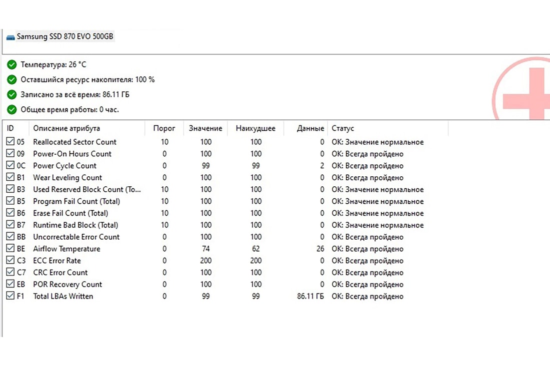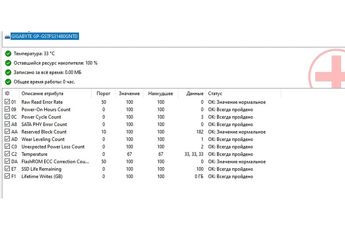 Считать атрибуты SMART можно посредством разнообразных утилит. Как правило, разрабатываемое ПО от производителей дисков великолепно справляется с этой задачей, но перегруженный графический интерфейс усложняет восприятие. Каждый пользователь сам выбирает удобный и привычный ему способ, хотя большинство пользователей попросту не заглядывают в этот раздел. Мы использовали для считывания атрибутов раздел «Хранение данных» утилиты AIDA64 Extreme, но кому-то может показаться более наглядным GUI утилиты CrystalDiskInfo. Подробно заострять внимание на атрибутах не станем, отметим лишь, что все диски до начала тестирования были новыми и не имели проблем по части S.M.A.R.T. А чтобы научиться понимать атрибуты, рядовому пользователю достаточно ознакомиться со статьей в «Википедии».