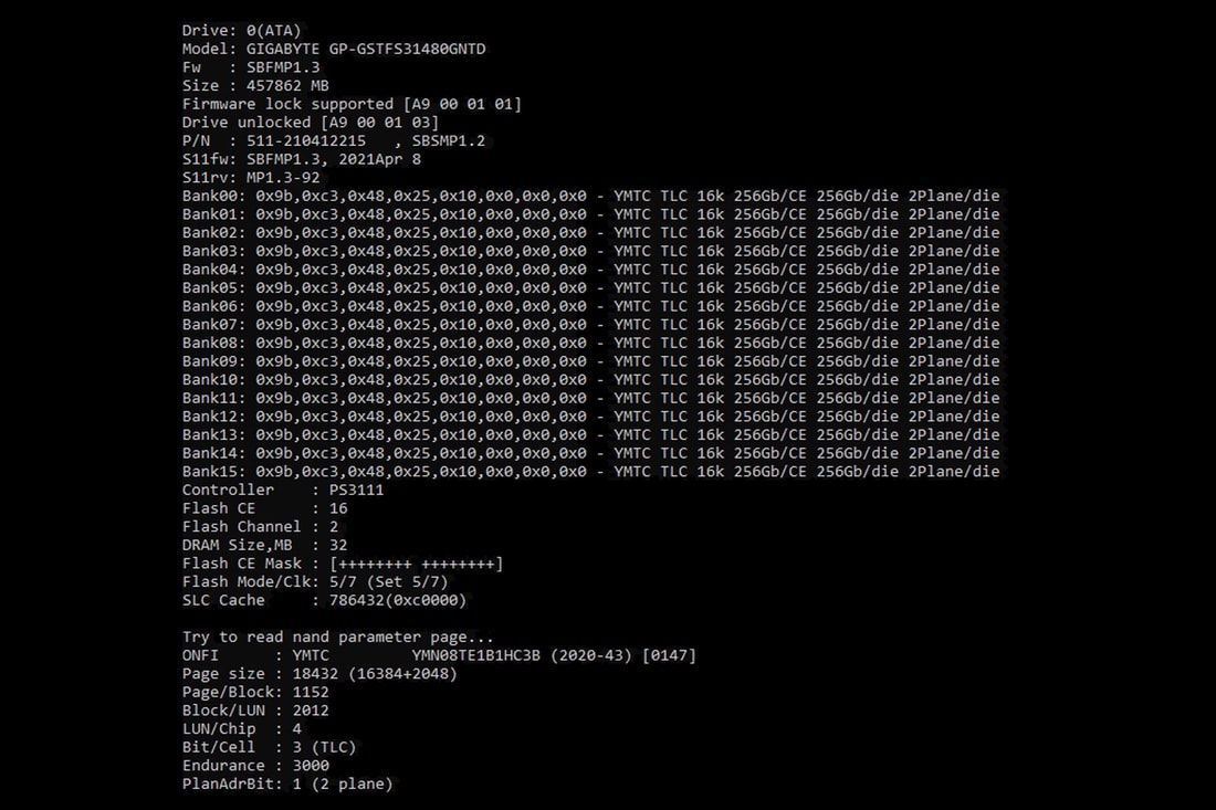 Аппаратная начинка накопителей Gigabyte, Crucial и Netac полностью соответствует данным, полученным от утилит VLO, ошибок нет. Kingston A400, как мы уже озвучили, построен на достаточно старом контроллере Мarvell 88NV1120. Однако без софта определить точные характеристики установленных чипов не получилось, маркировка неохотно гуглится и убеждает нас в TLC-чипах, но на этом подробности заканчиваются. Погуглить пришлось и память YMTC — для нее нашелся вполне себе корректный даташит.