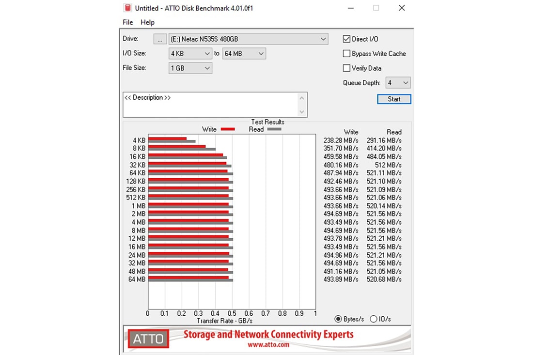 Netac N535S 480GB — самый бюджетный накопитель от Netac очень неплохо показал себя в бенчмарках, несмотря на QLC-чипы. Однако это потому, что он прятался за SLC. А вот линейная запись больших объемов дается диску тяжело. Чуть менее 10% пишутся на максимальной скорости, а дальше начинается уже знакомая по BX500 «пила», весьма характерная именно для QLC. Тем не менее средняя скорость записи — 114 МБ/с.