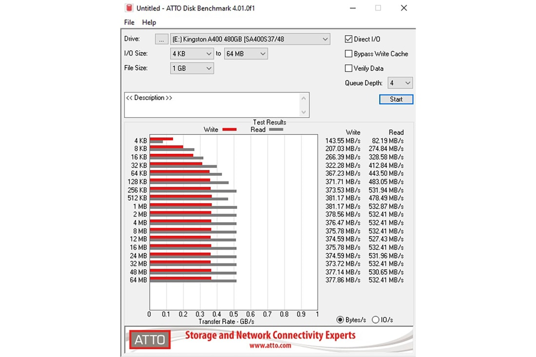 Данная утилита давно не обновляется, но по традиции используется в большинстве обзоров накопителей. Бюджетный накопитель от Kingston не самым уверенным образом ведет себя в операциях записи с блоками любых размеров. Каждая из программ для тестирования запускалась по несколько раз, и результаты воспроизводимы и типичны для конкретных экземпляров.