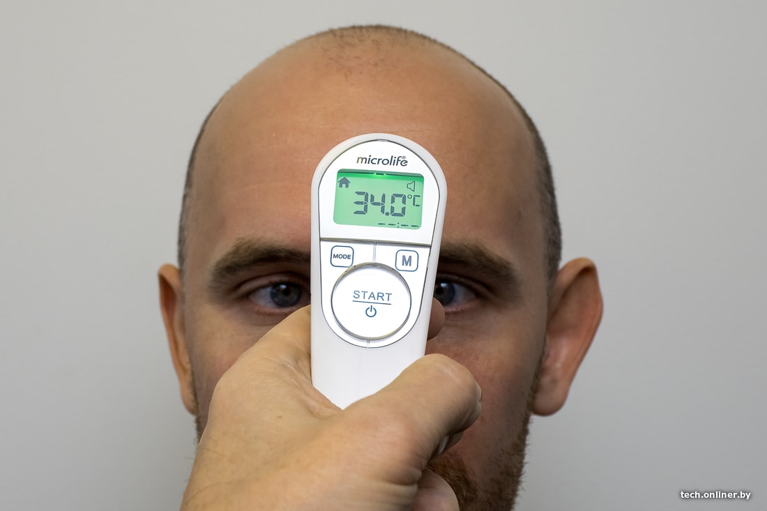 Следующим «испытуемым» стал бесконтактный инфракрасный градусник Microlife NC200. Он заметно крупнее электронного, в комплекте есть чехол. Однако его преимущество в другом: этот ИК-термометр измеряет значительно быстрее ртутного или электронного градусника и позволяет делать это на потоке. Кроме того, термометр можно использовать для измерения температуры поверхностей и жидкостей (в руководстве пользователя упоминается молоко, вода и окружающая среда).