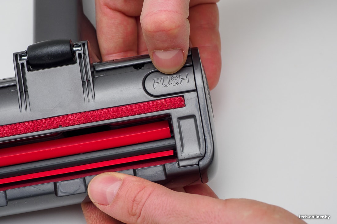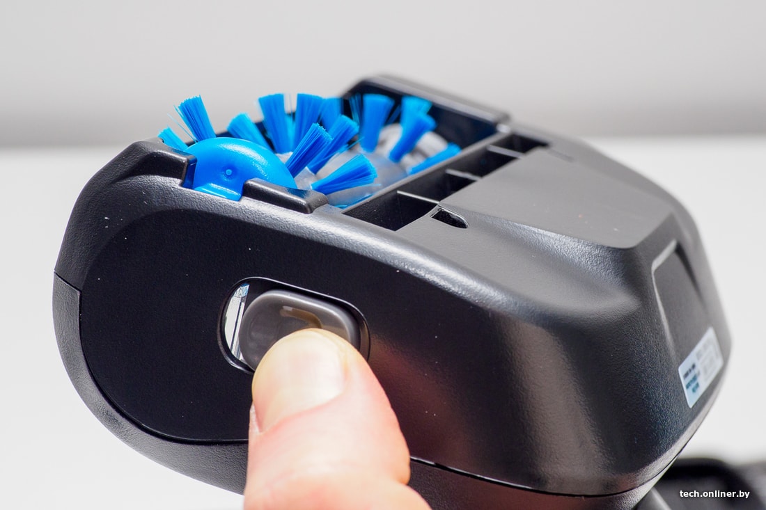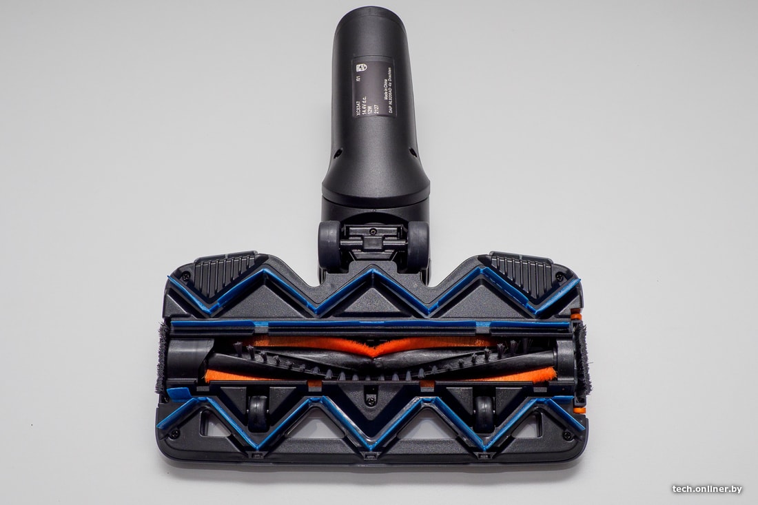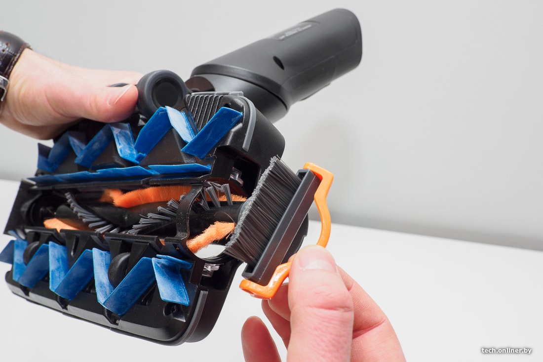 Вал съемный — достается, если потянуть за яркую дужку сбоку. Из особенностей насадки — гибкие направляющие синего цвета. По размеру они выше колес, так что таскаются по полу и направляют мусор к небольшим отверстиям. А дальше — щетка, труба, пылесборник.