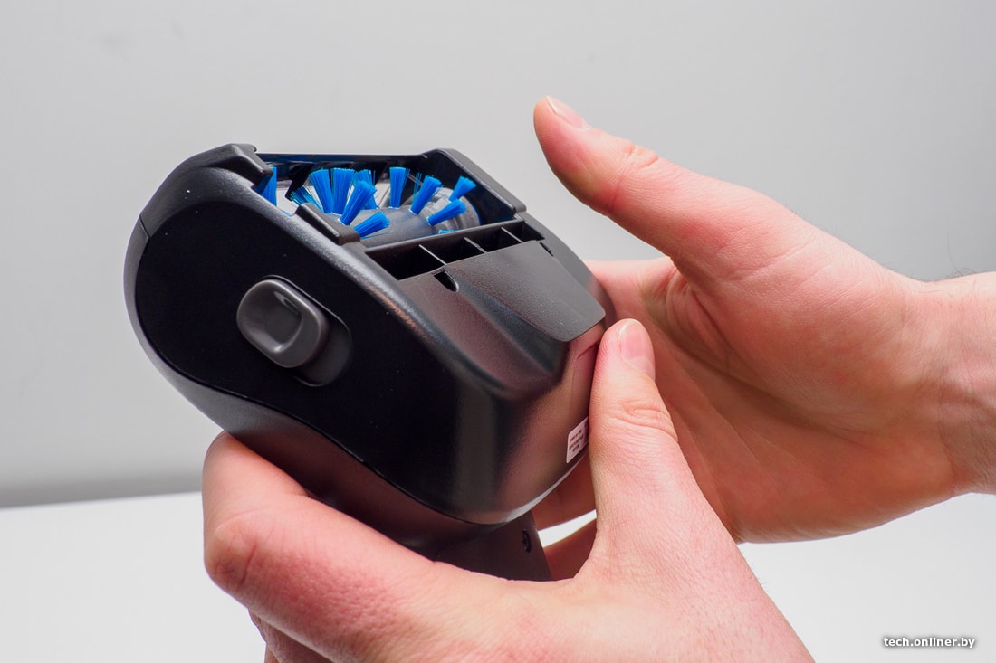 В остальном все здорово. Сухая уборка — хорошо, влажная (за счет вращающихся щеток пылесос едет почти сам) — отлично. Удобно опустошать пылесборник и обслуживать фильтры, хранить дополнительные насадки и чуть что иметь возможность заменить аккумулятор на уже заряженный (среднее время зарядки составляет 2 часа 40 минут).