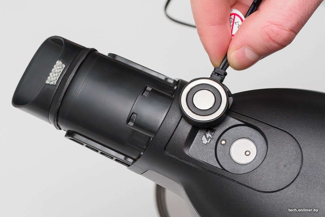 Все максимально просто: адаптер питания с накладкой с электрическими контактами на магните и компактный настенный пластиковый держатель. Зарядить АКБ пылесоса можно просто приложив накладку к контактам на корпусе пылесоса. Или вставить накладку в специальный паз держателя и хранить пылесос на нем, одновременно подзаряжая. Длина шнура адаптера питания составляет 1,8 м.