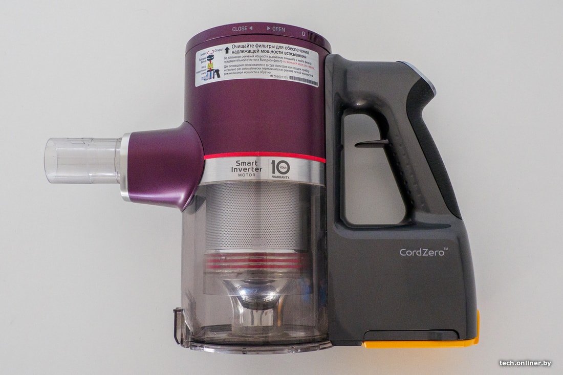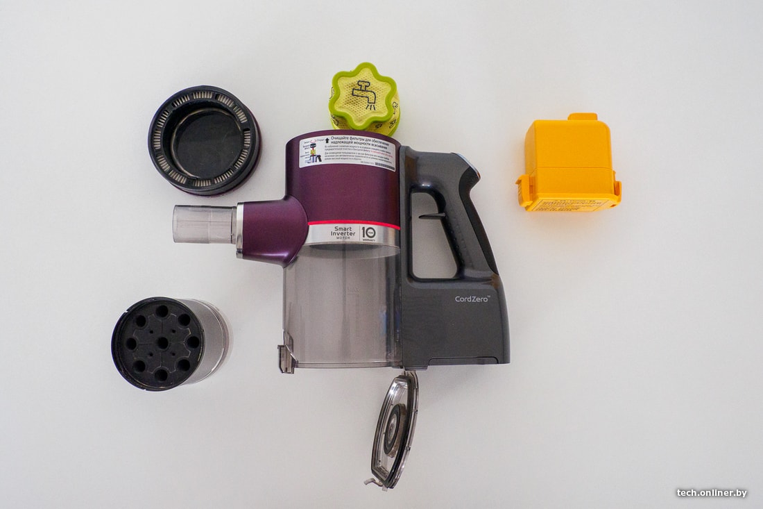 Компоновка узлов устройства похожа на пылесос Bosch — пылесборник стоит перпендикулярно трубе. Мотор размещен сверху контейнера – как у пылесоса Samsung. Сплошные флешбеки к четвертой-то модели.
