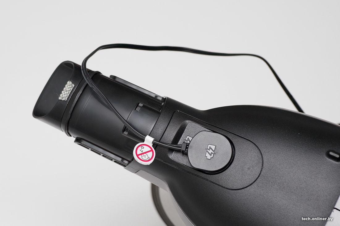 У пылесоса классический, то есть пистолетный хват и съемная АКБ (желтая, веселая). А еще на ручке прорезиненная вставка — только у этой модели из всех изученных.