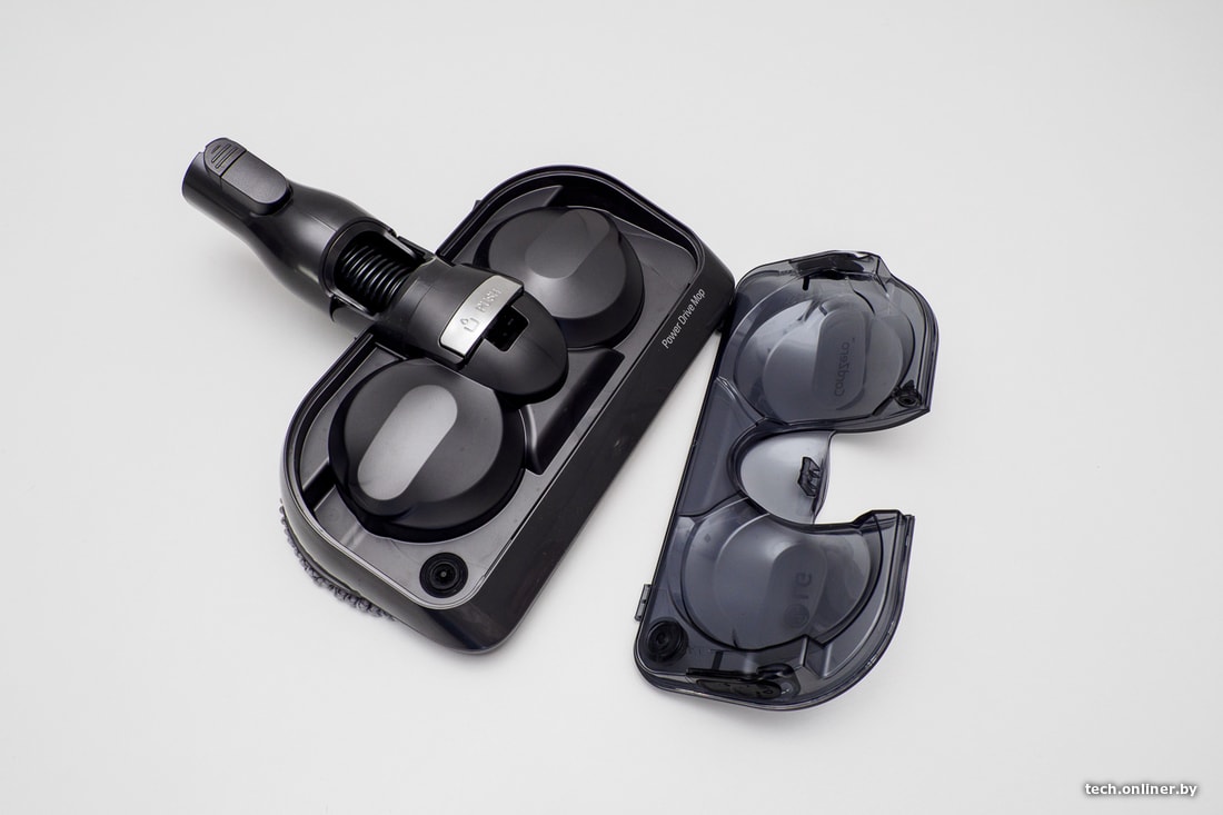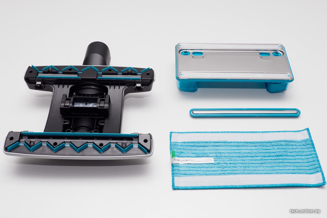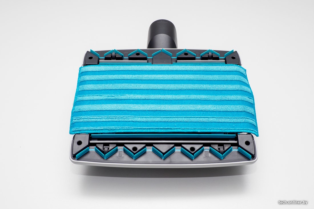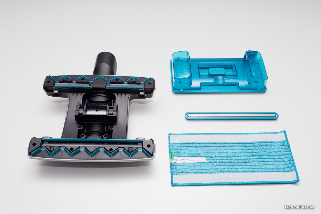 Насадка для влажной уборки не электрифицирована. Состоит из нескольких частей. В основе корпус на колесиках в виде буквы Н. Видны три всасывающие щели с заглушками (одна спереди, две сзади) и знакомые гибкие направляющие. К этому корпусу снизу прикрепляется емкость для воды (объем 300 мл). Дно емкости плоское. На нем два выходных отверстия и два ряда липучки. Отверстия закрываются специальной планкой — увлажняющей полоской. А сверху на липучки крепится накладка из микрофибры.