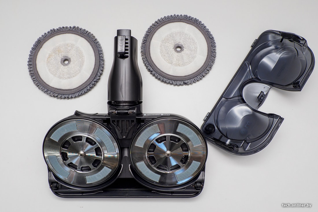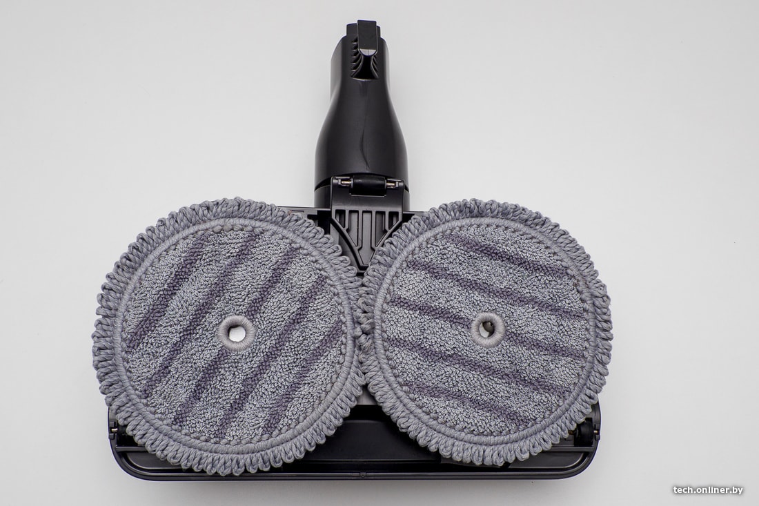 С водой отдельная система. На корпусе насадки есть кнопка регулировки количества воды с тремя положениями: «меньше воды», «нет подачи воды», «больше воды». Перед началом влажной уборки пользователь смачивает и прикрепляет к кругам моющие накладки и подает на них воду по своему усмотрению. При этом вода подается не самотеком: внутри есть электромотор с помпой.
