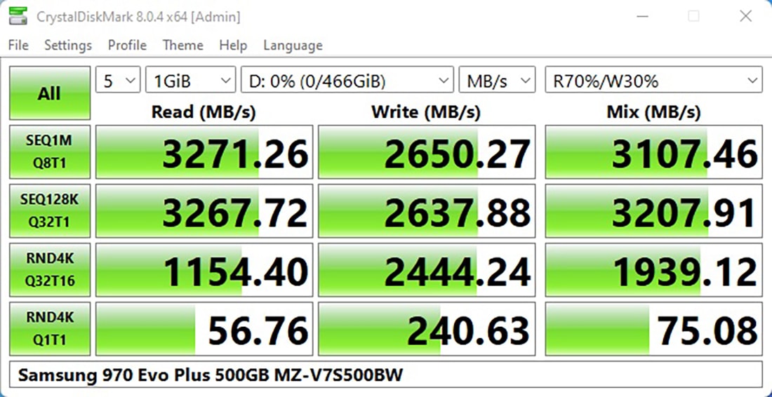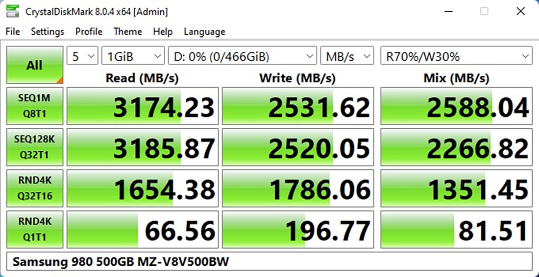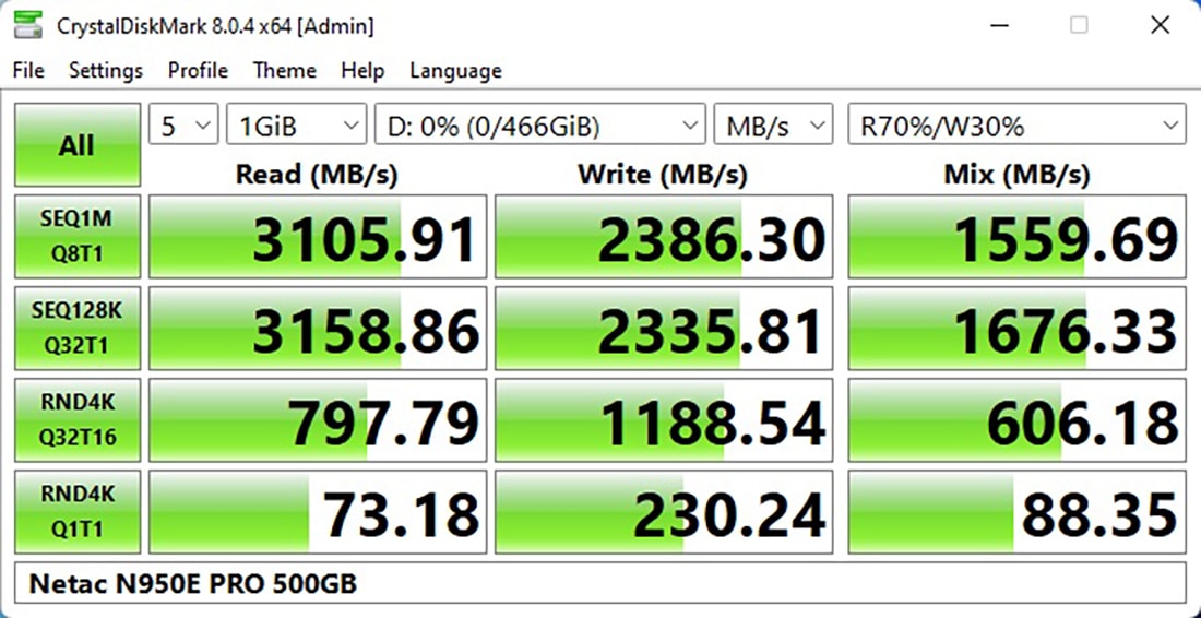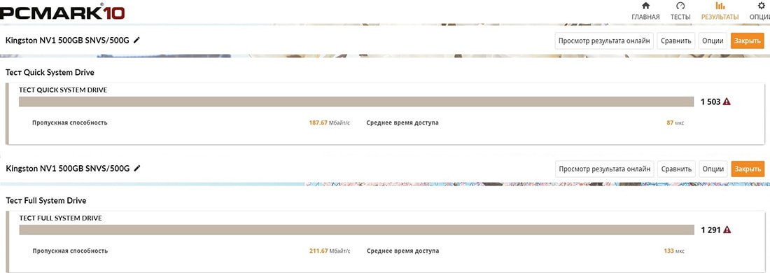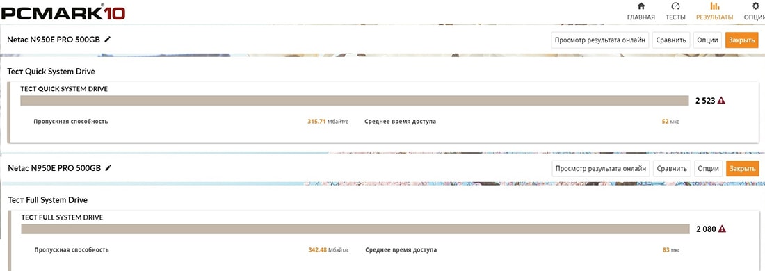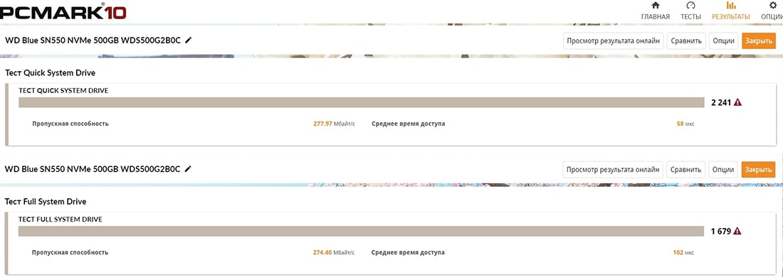 В более коротком тесте накопители Quick System Drive — Samsung 980 500GB MZ-V8V500BW и Netac N950E PRO 500GB впечатляюще хороши и выбивают более 2500 баллов. Практически «в спину дышит» WD Blue SN550 NVMe 500GB WDS500G2B0C. Остальные участники «топчутся» в районе 1500—1600 баллов, не выходя за рамки результата SATA-диска.