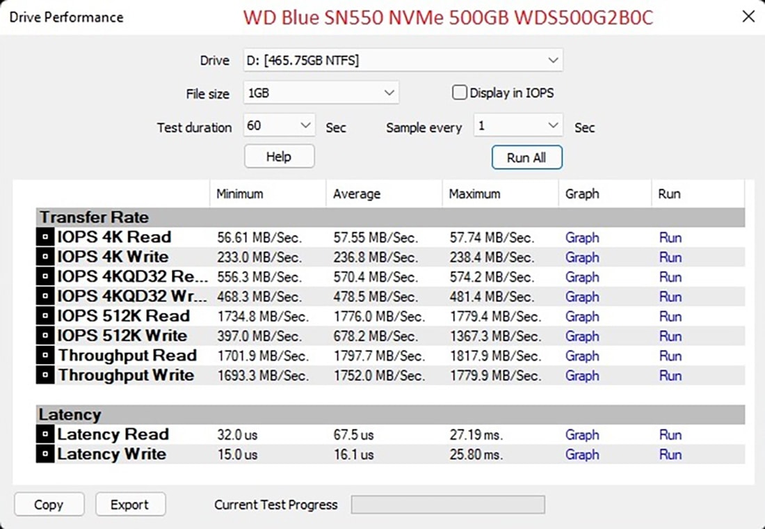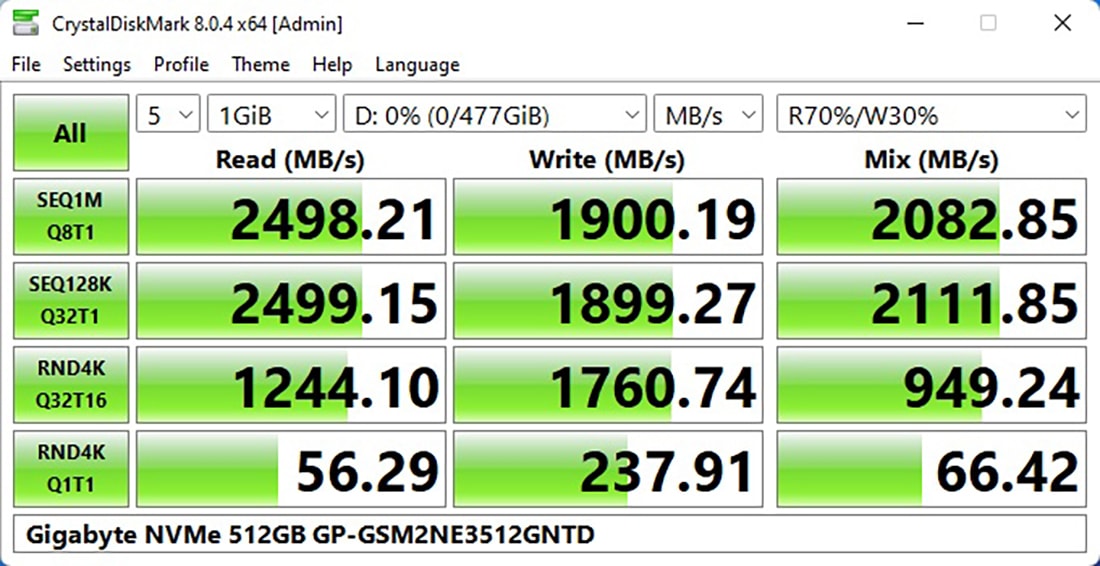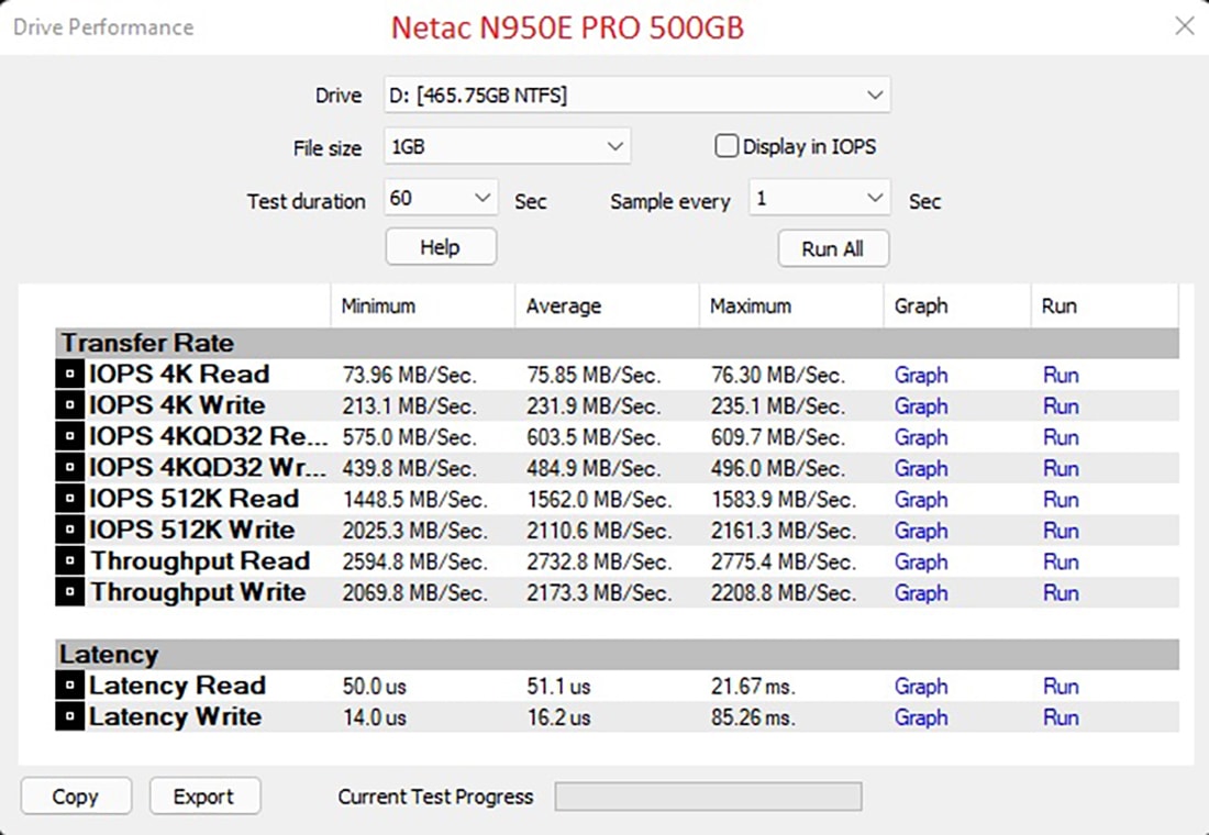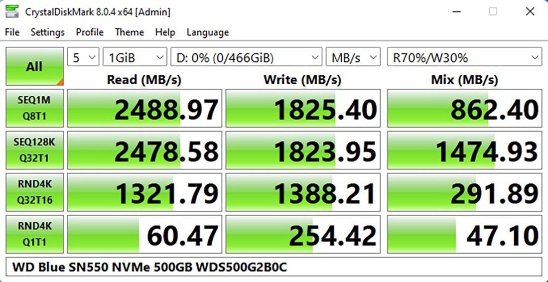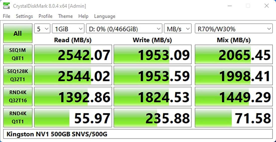В более коротком тесте накопители Quick System Drive — Samsung 980 500GB MZ-V8V500BW и Netac N950E PRO 500GB впечатляюще хороши и выбивают более 2500 баллов. Практически «в спину дышит» WD Blue SN550 NVMe 500GB WDS500G2B0C. Остальные участники «топчутся» в районе 1500—1600 баллов, не выходя за рамки результата SATA-диска.