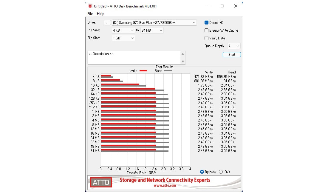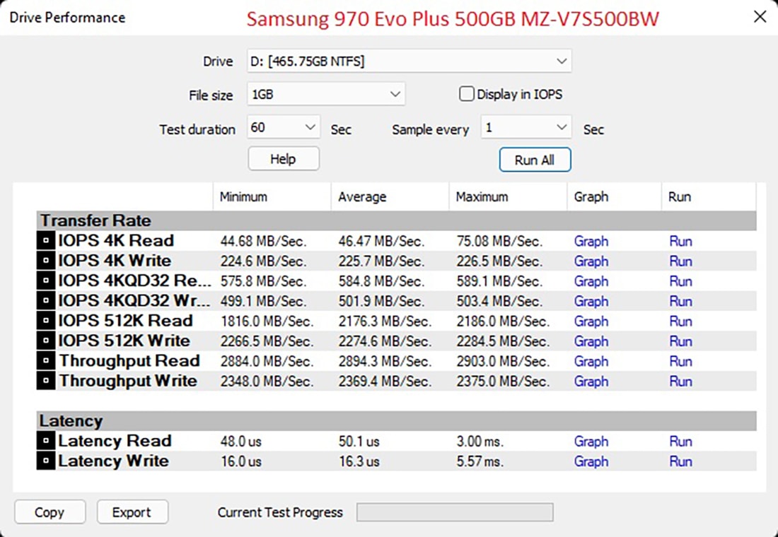 Для того чтобы продемонстрировать разницу между интерфейсами подключения и преимущества NVMe, в сводные графики был добавлен зарекомендовавший себя наилучшим образом Samsung 870 Evo 500GB MZ-77E500BW с результатами тестирования из первой статьи.